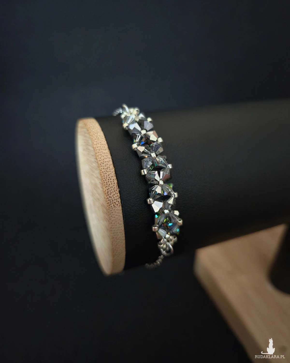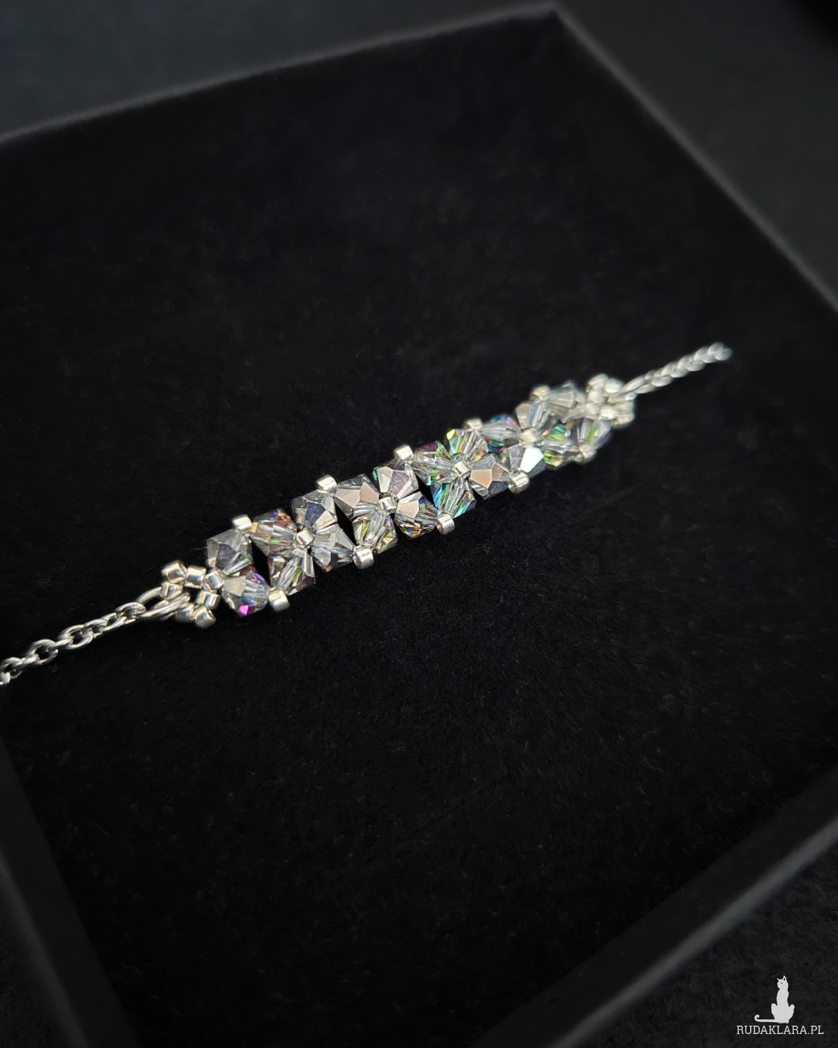 Bransoletka powstaje z kryształków Preciosa w kolorze Vitrail Medium, które dzięki opalizującemu wykończeniu zachwycają wielobarwną grą światła. W zależności od kąta padania światła pojawiają się subtelne refleksy zieleni, błękitu, złota i ciepłych tonów pomarańczy, nadając biżuterii dynamiczny, szlachetny charakter. Towarzyszą im drobne koraliki Miyuki Delica w srebrnym odcieniu, znane z wyjątkowej regularności i precyzji wykonania.