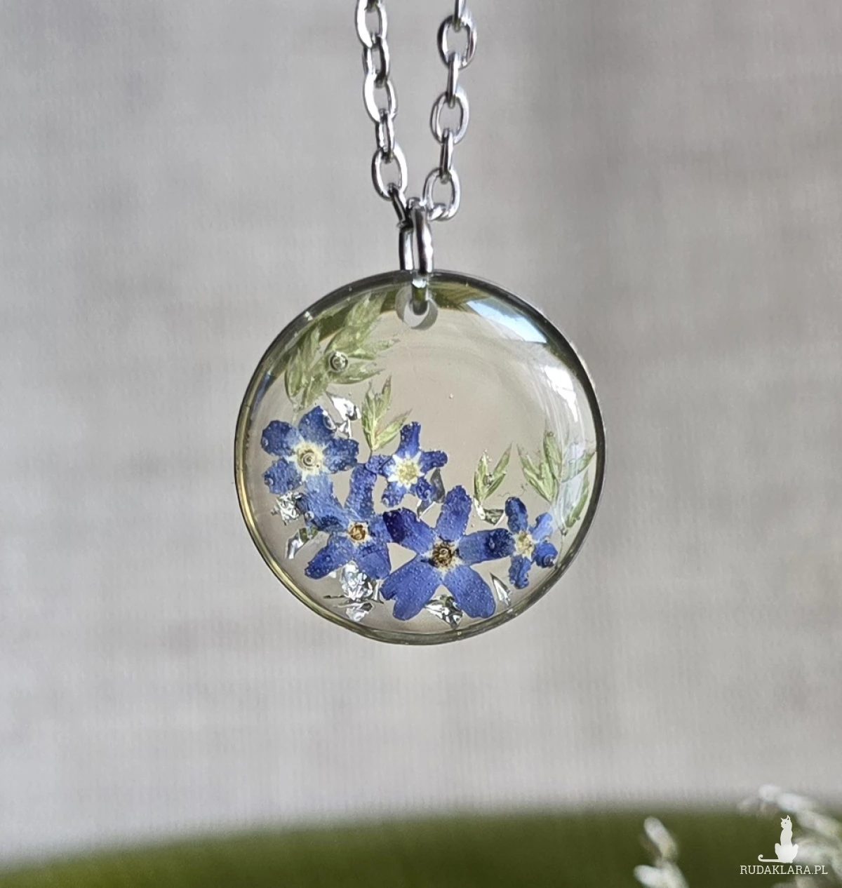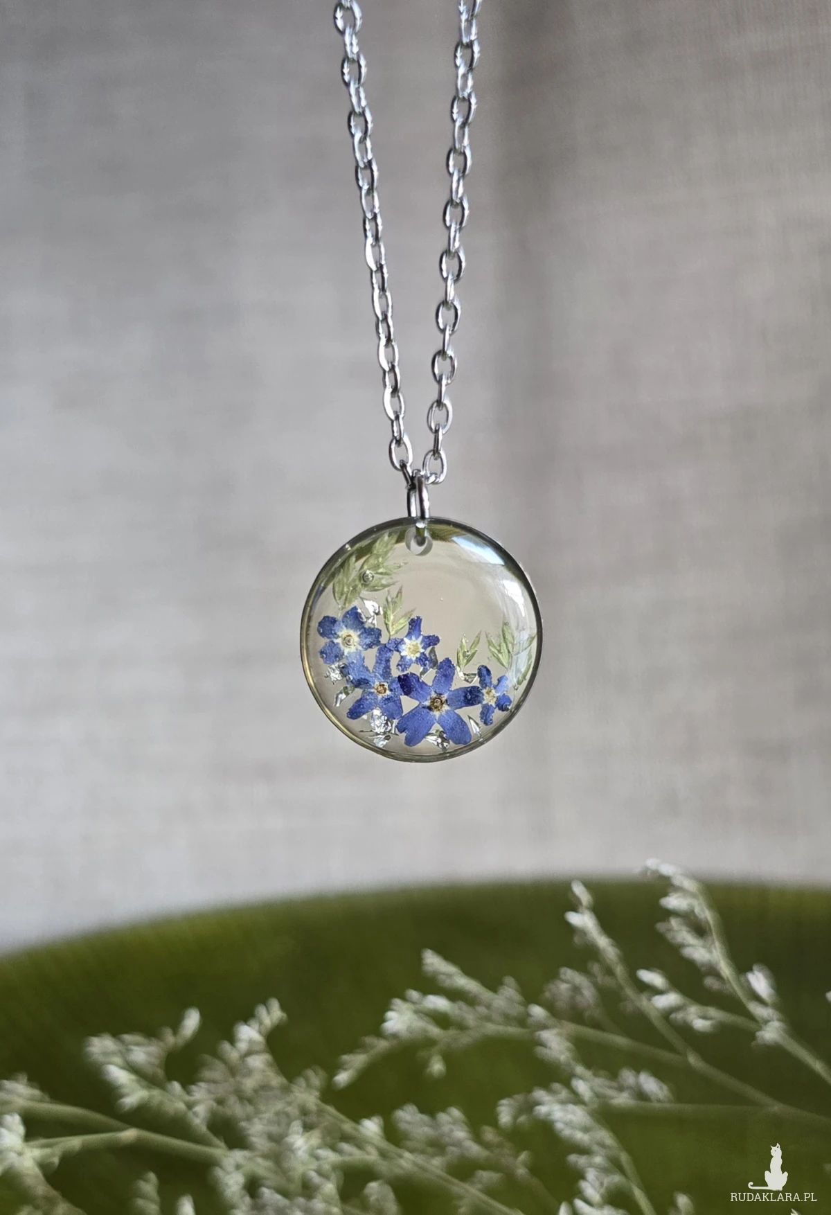 Oferuję Państwu unikalną biżuterię. Zawieszka jest wykonana z suszonych kwiatów i żywicy epoksydowej. Biżuteria jest wspaniałym i oryginalnym prezentem na lata.