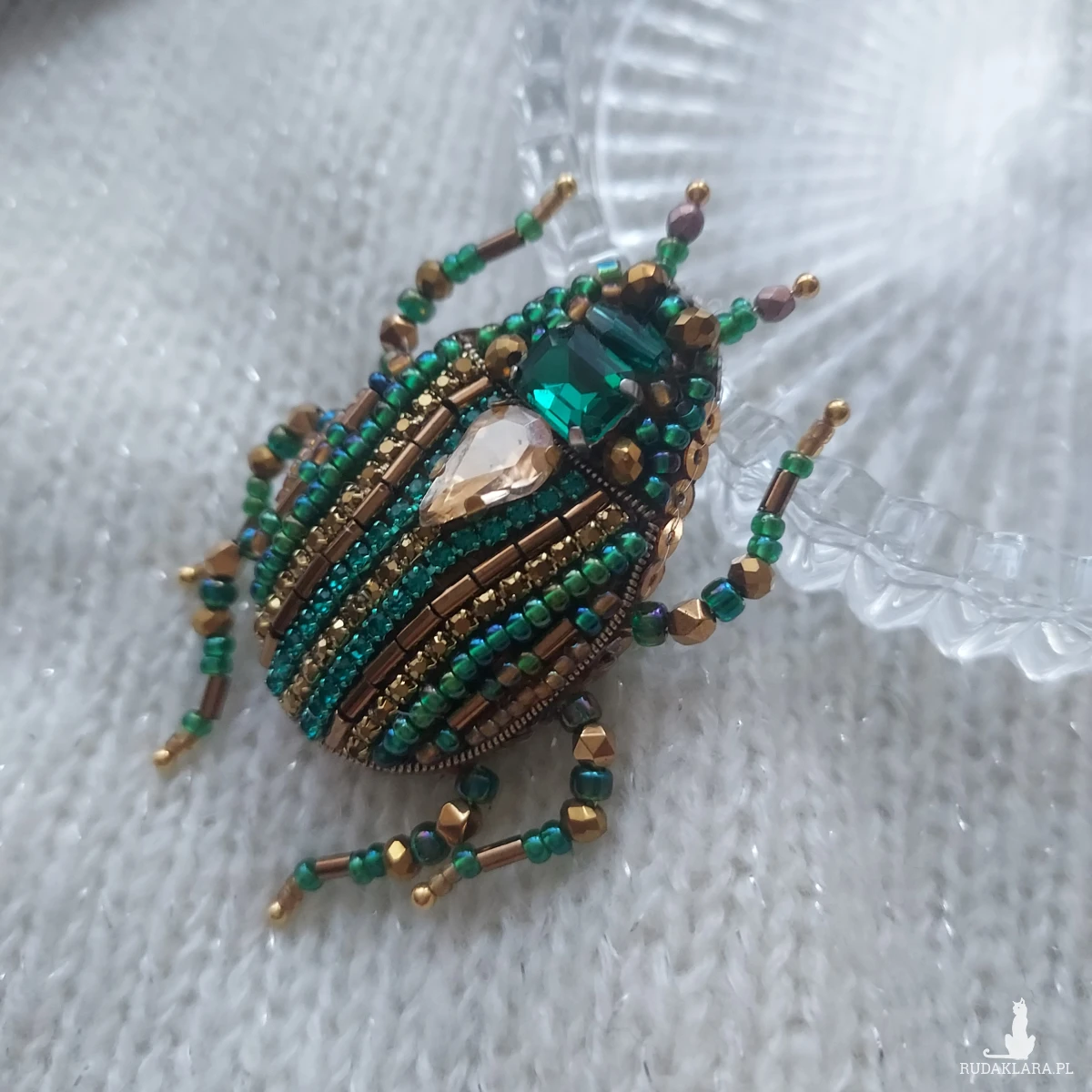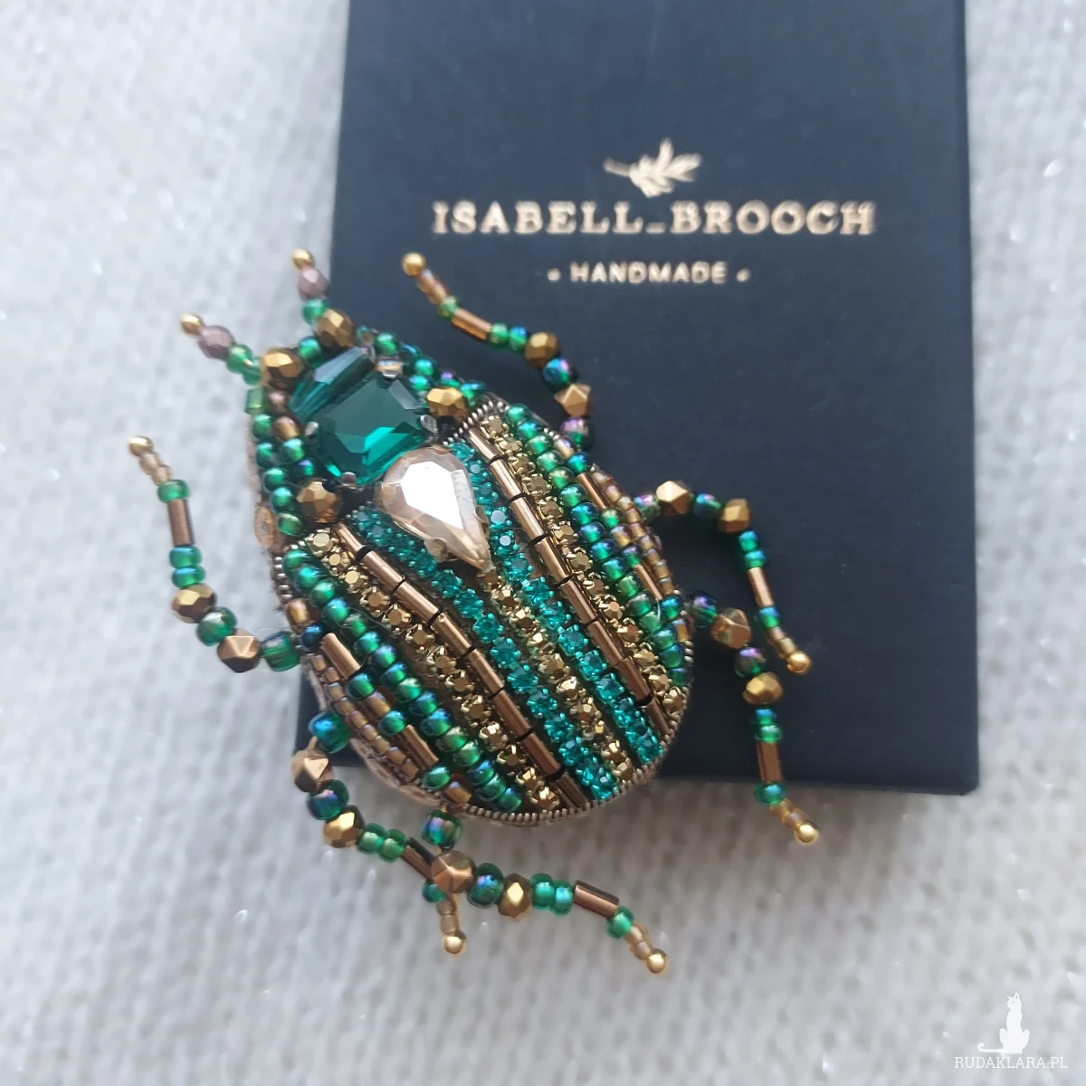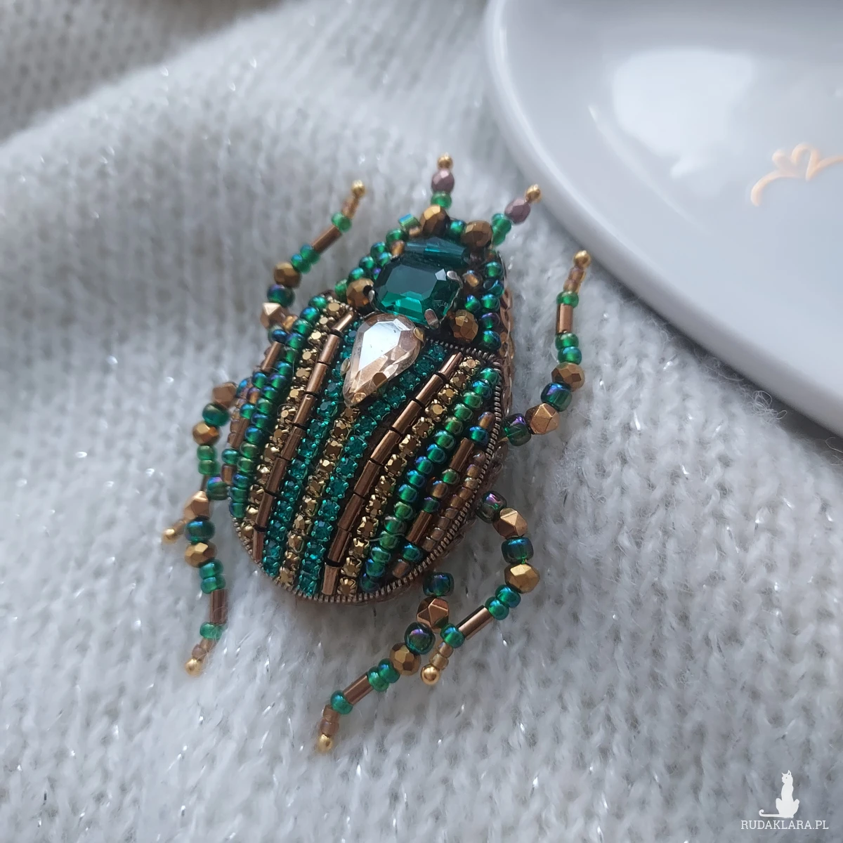 Urocza broszka ŻUK w cudownym zestawieniu brązu i zieleni to niezwykły dodatek biżuteryjny nie tylko dla miłośniczek przyrody i owadów.