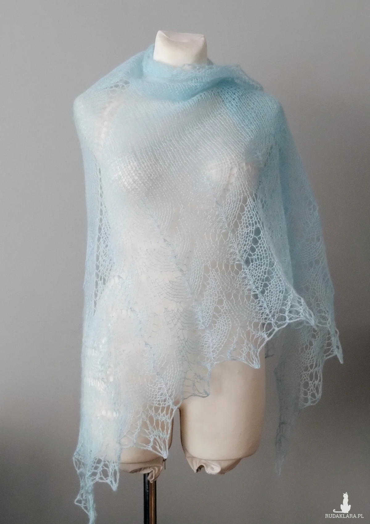 z mieszanki wełny, moheru i akrylu w kolorze jasnego błękitu. Chusta mgiełka.Wymiary: szerokość 220cm, długość 100 cm. Prać ręcznie w temperaturze 30 stopni, suszyć na leżąco .