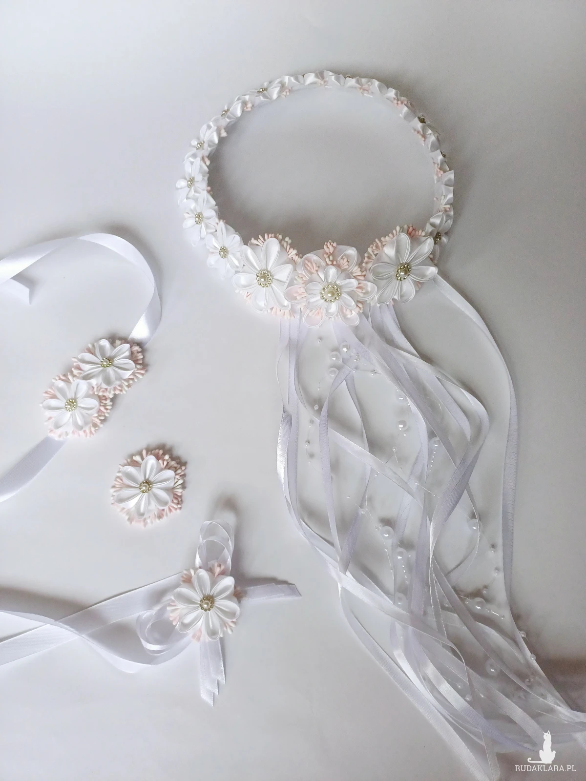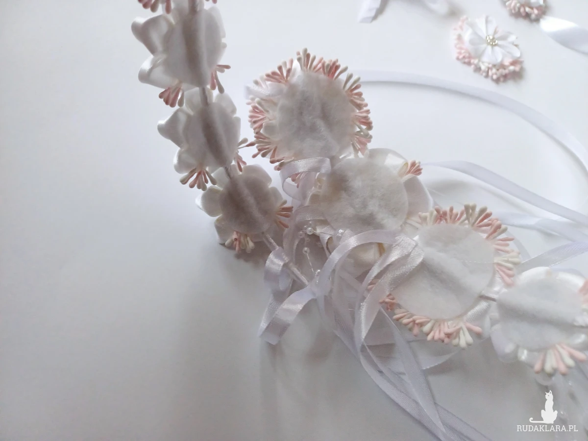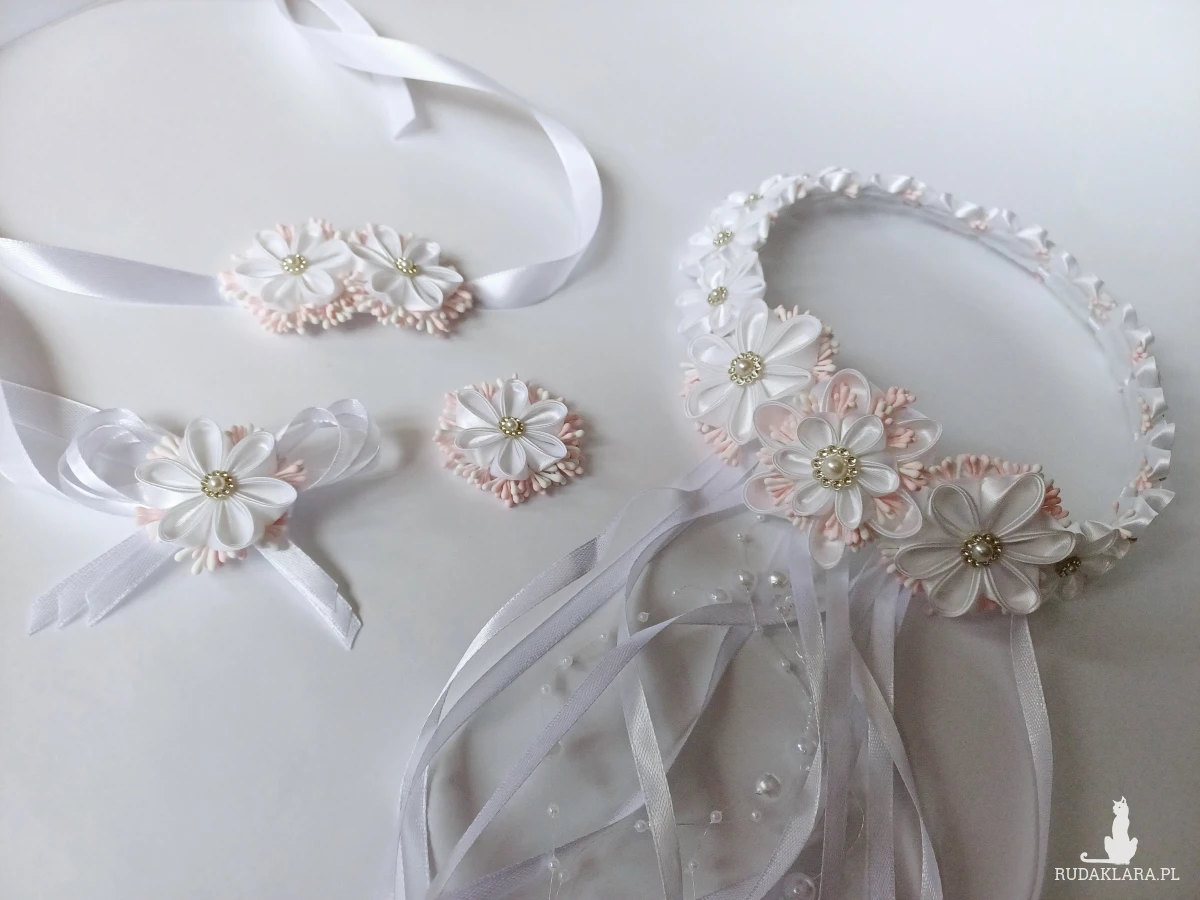 Piękny wianek komunijny plus ozdoby: na rękę, na świecę i na torebkę. Cały zestaw stworzyłam sama. Baza wianka - Kwiaty trzymają się na delikatnym, cienkim drucie owiniętym satynową białą wstążką. Wianek nie jest "zamknięty", dlatego można go delikatnie dopasować do obwodu głowy dziecka - wiązanie za pomocą wstążek. W komplecie dodatkowy kwiatuszek luzem, aby wsunąć na wianek w razie potrzeby (gdyby obwód głowy był większy). Kwiaty do wianka wykonałam z białych tasiemek satynowych japońską metodą tsumami. Większość kwiatów na wianku ma średnicę 4cm, natomiast stroik na tyle wianka składa się z kwiatów o średnicy: środkowy 6cm, a dwa boczne 5cm. Na środku kwiatów jest przyklejona biała półperełka z kryształkami wokół niej, kwiaty ozdobione są kolorowymi pręcikami (róż, biel). Tył wianka ozdabiają również luźno spuszczone wstążki o szerokości 6mm oraz długości około 31cm. Śliczny efekt tworzy również biała girlanda z perełek miedzy wiszącymi wstążkami.