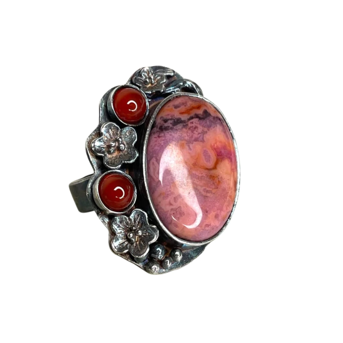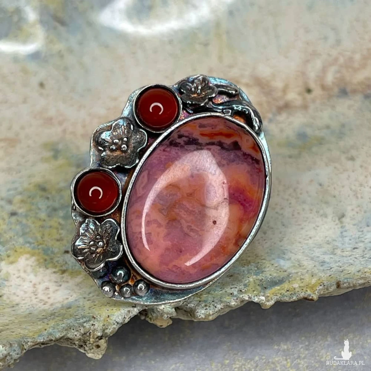 Jak malarski pejzaż inspirowany zachodzącym słońcem – agat koronkowy zachwyca subtelną grą barw, łącząc odcienie różu, pomarańczu i barw pomiędzy w jedyny w swoim rodzaju wzór. Jego ciepłe tony doskonale komponują się z intensywną czerwienią karneoli, które niczym ostatnie promienie zachodu słońca dodają kompozycji głębi i charakteru. Oksydowane srebro, ozdobione misternymi kwiatowymi detalami, podkreśla artystyczny styl biżuterii, nadając jej romantycznego, lekko baśniowego uroku Kamień: agat koronkowy, karneol Materiał: srebro próby 925 Wykończenie czernione, miejscowo przecierane, miejscowo polerowane Rozmiar jubilerski: 15 mm Wielkość kamienia: 20×15 mm Waga produktu: 10,53 g Masa srebra: 7,6 g Biżuteria zostanie zapakowana w ozdobne pudełko. Ze względu na różne ustawienia monitorów, kolory mogą się delikatnie różnić na żywo.