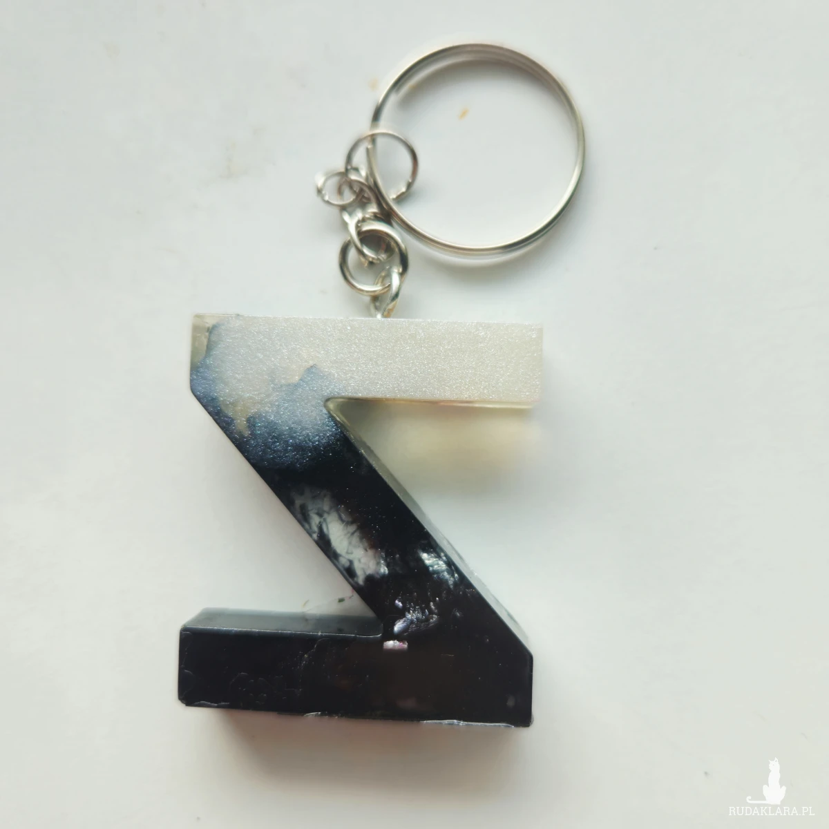 Brelok literka Z z żywicy z płatkami kwiatów czernią i bielą