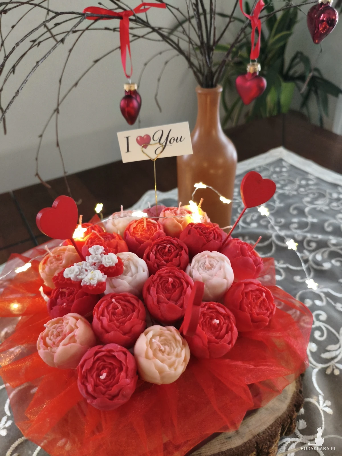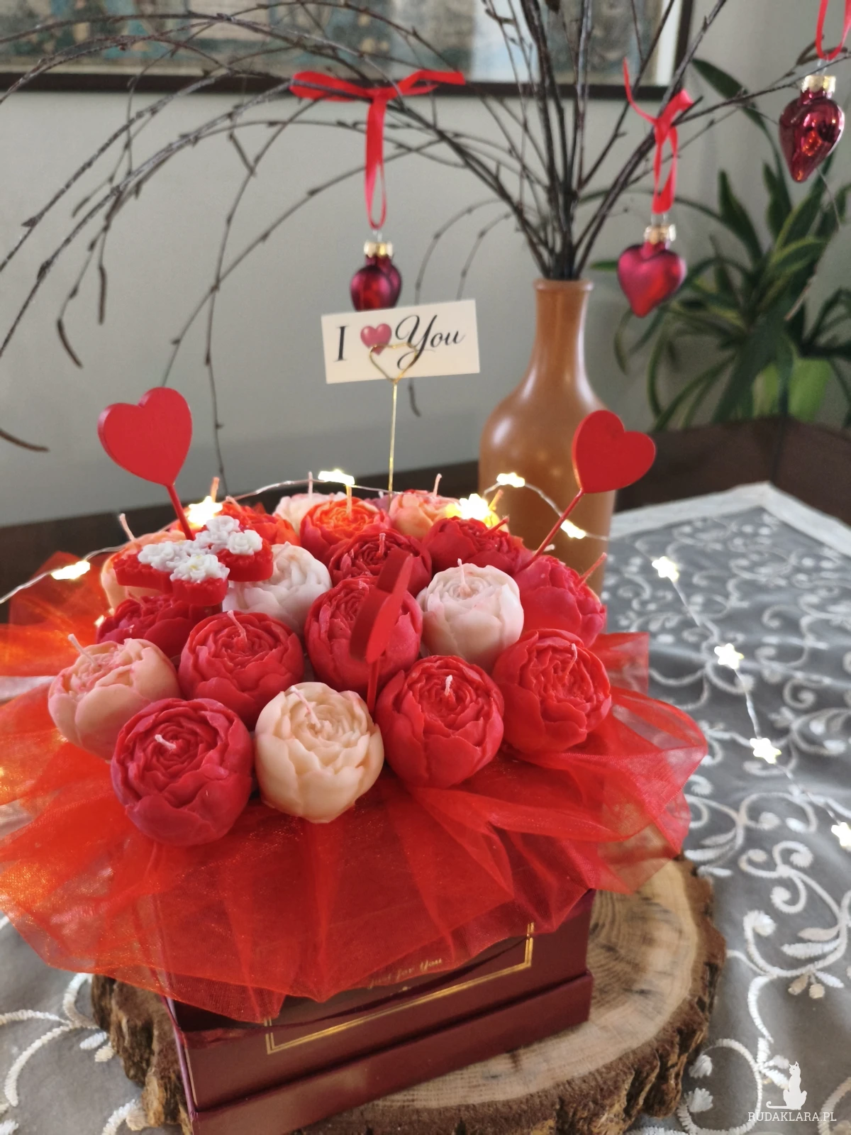 Flower box zawiera główki kwiatów które po wyciągnięciu z bukietu można zapalić. Flower box wysyłam zapakowany w celofan, wstążkę i bukiecik ze suszu oraz instrukcją palenia świec - gotowy do wręczenia jako prezent.