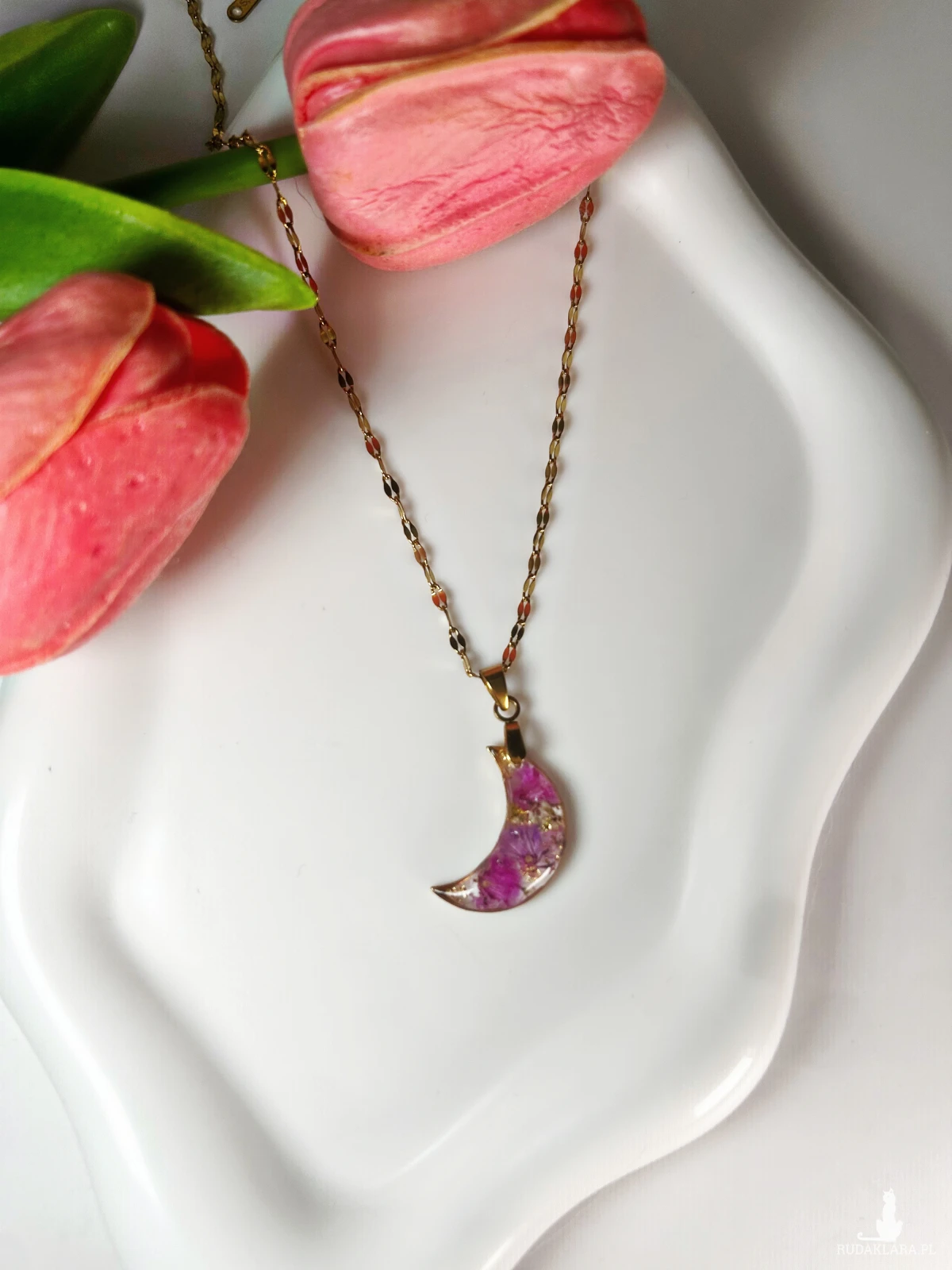 ✨ Ręcznie robiony naszyjnik z prawdziwymi kwiatami zatopionymi w lśniącej żywicy. Całość oprawiona w złoty księżyc zawieszonym na łańcuszku ✨