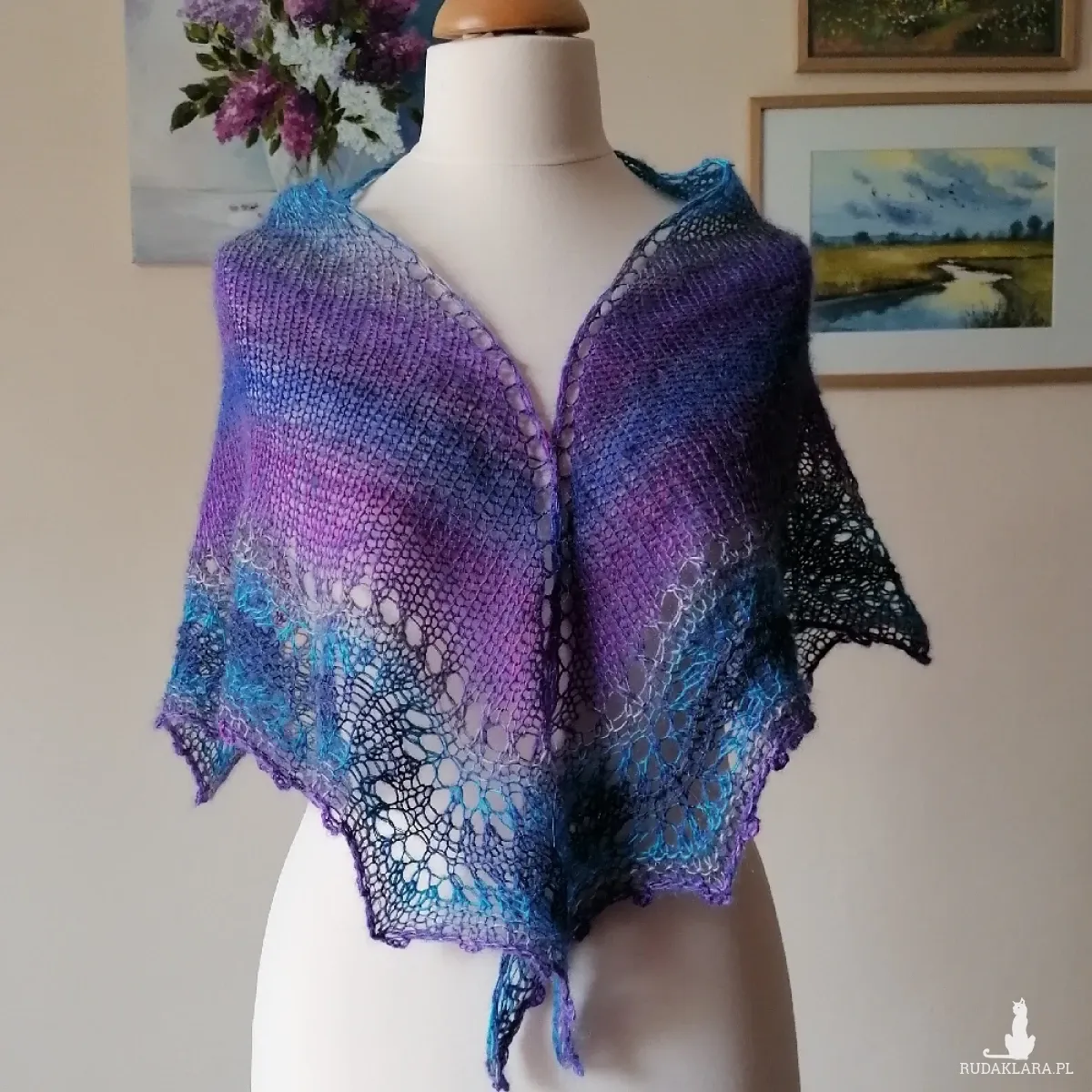 Lekka, miła, a przy tym ciepła chusta wykonana ręcznie na drutach podwójna nitką z delikatnych włóczek produkcji niemieckiej i australijskiej. Skład jednej: 70% moher, 30% jedwab, skład drugiej: 78% australijskiej wełenki i 22% poliamidu. Oryginalna, nasycona, a przy tym nie jaskrawa kolorystyka przyciąga uwagę. Chusta świetnie sprawdzi się o każdej porze roku, do różnych stylizacji. Wymiary chusty: 170 cm. bok najdłuższy, 72 cm wysokość trójkąta. Pranie ręczne.