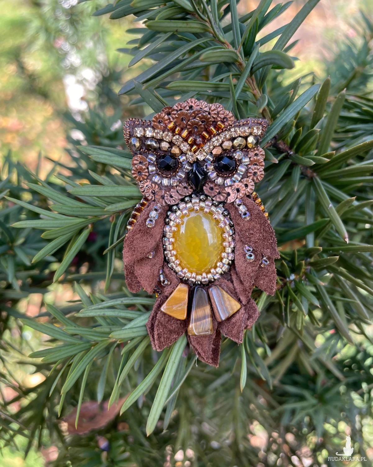Broszka Sowa w ciepłych odcieniach cynamonu, beżu i złota.