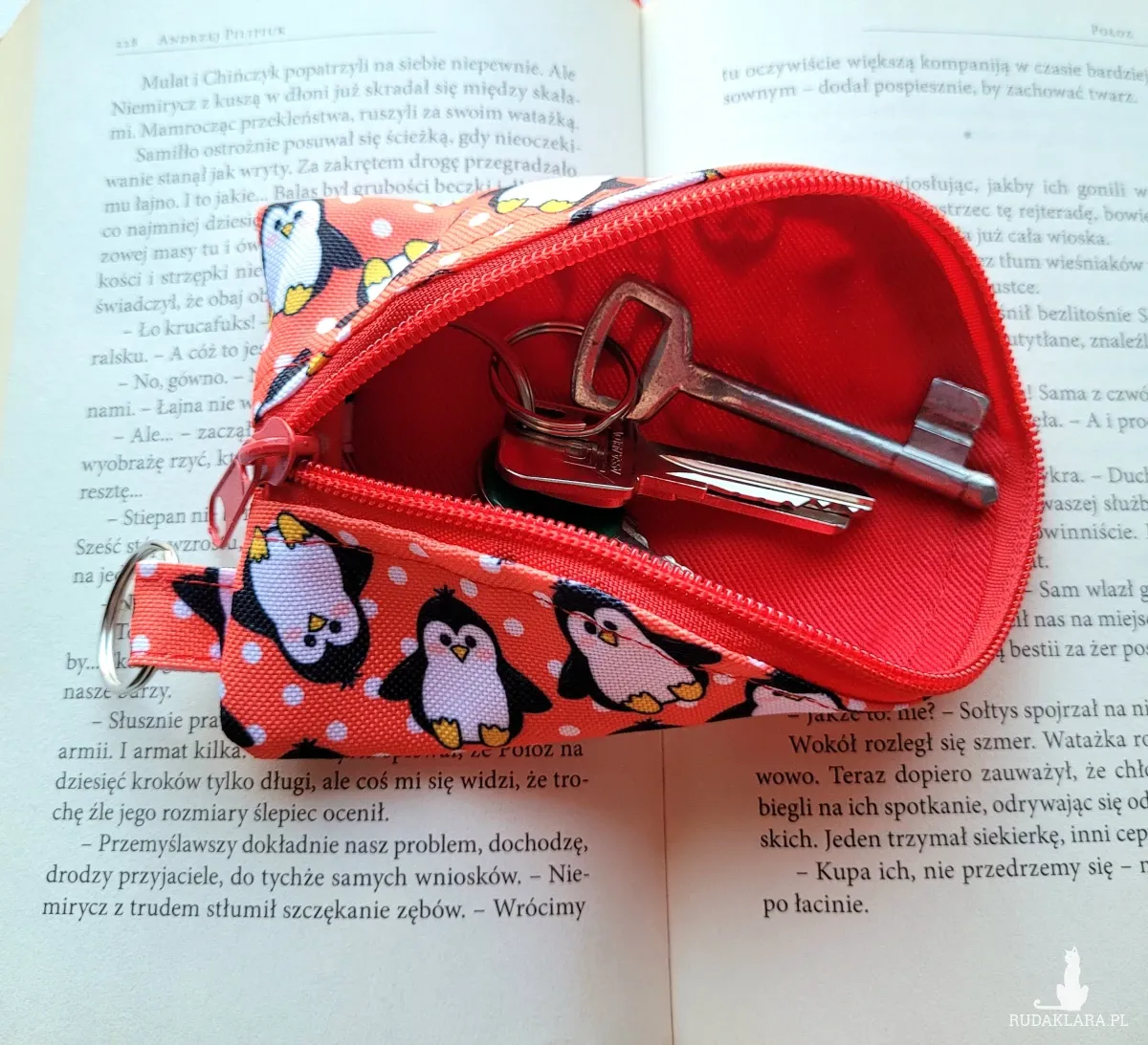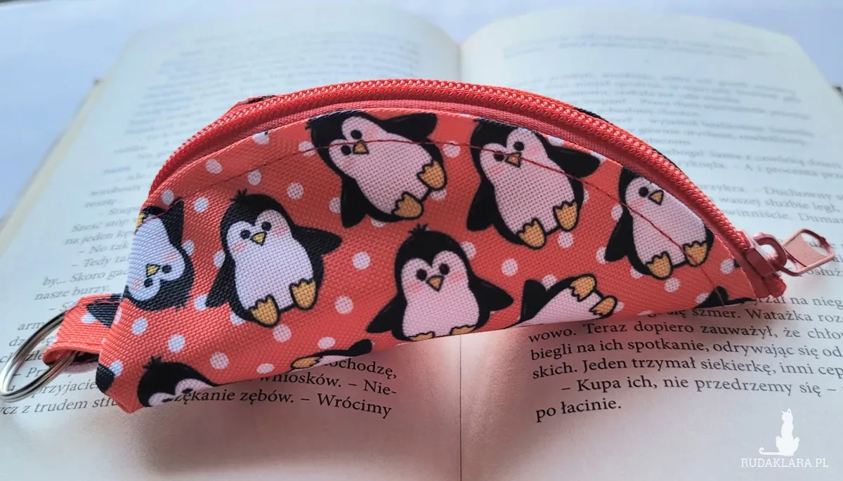 Praktyczne etui na klucze o oryginalnym kształcie wykonane w malutkiej polskiej pracowni. Praktyczny format 15x9 cm zmieści klucze oraz niewielki breloczek. Wykonane z tkaniny wodoodpornej z motywem wesołych pingwinków. Wewnątrz gruba podszewka pełniąca funkcję delikatnego usztywnienia. Kółeczko do przypięcia kluczy wewnątrz oraz na zewnątrz.