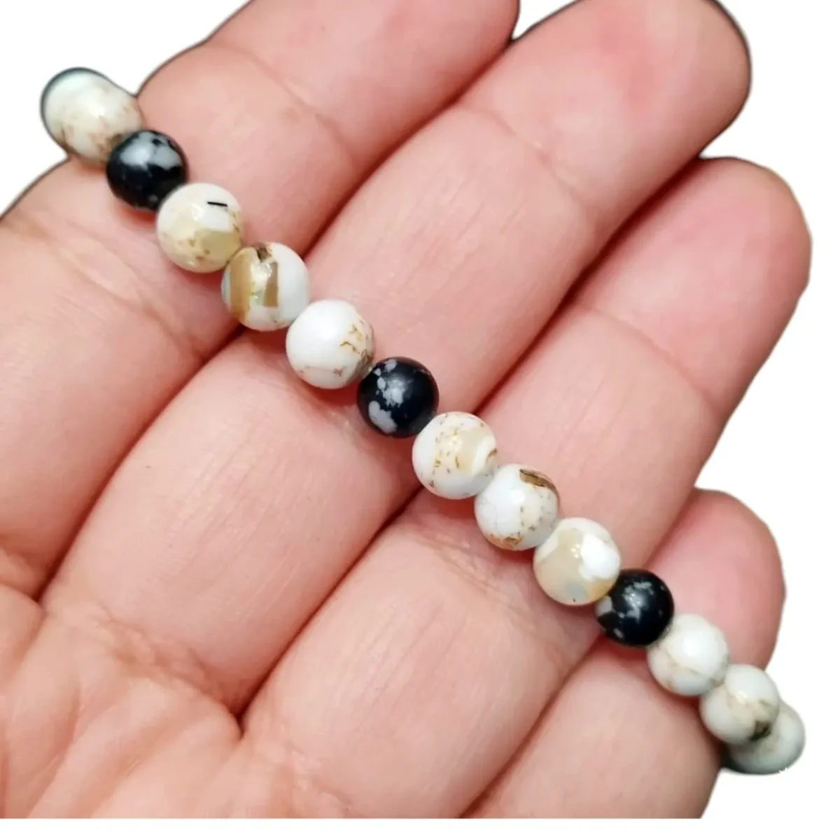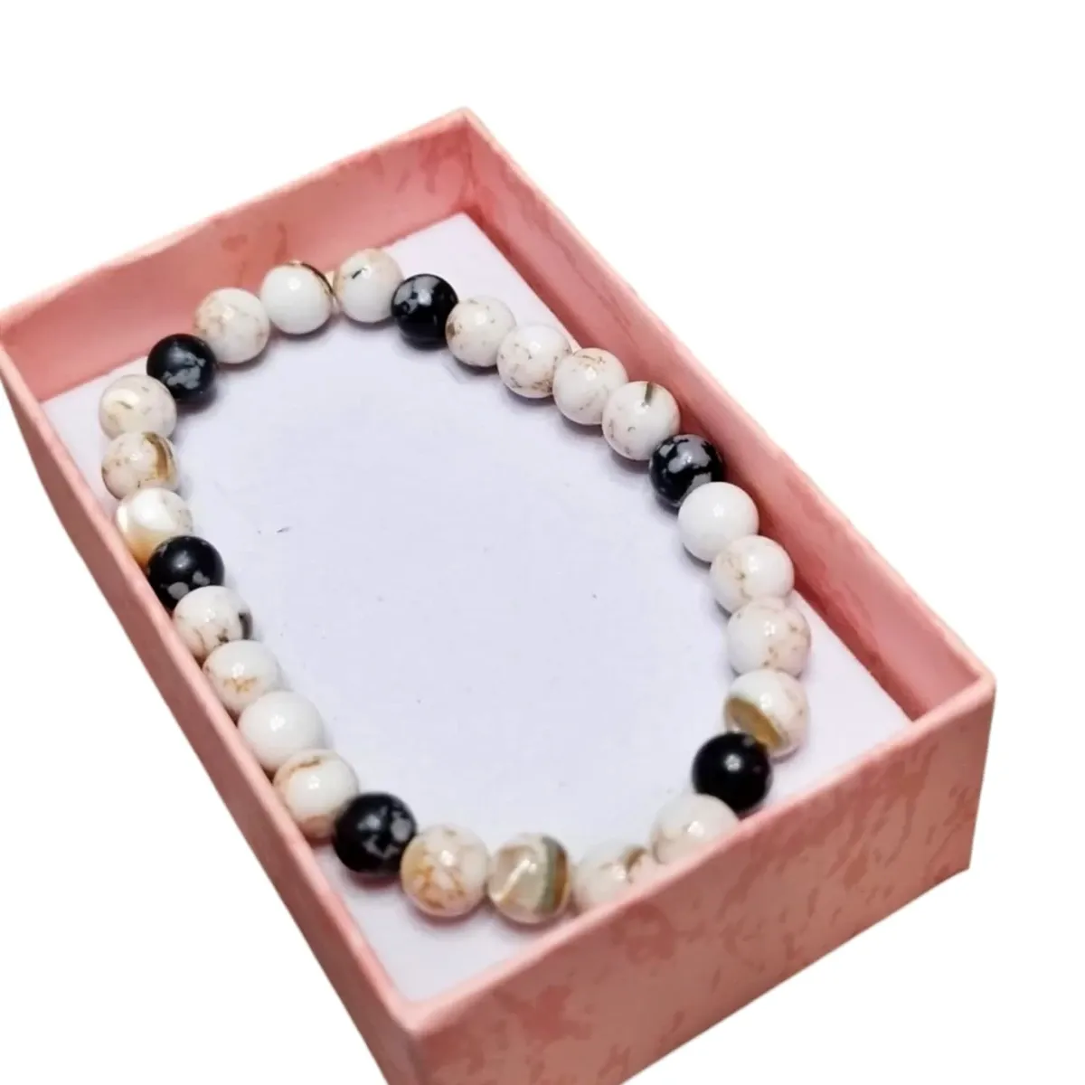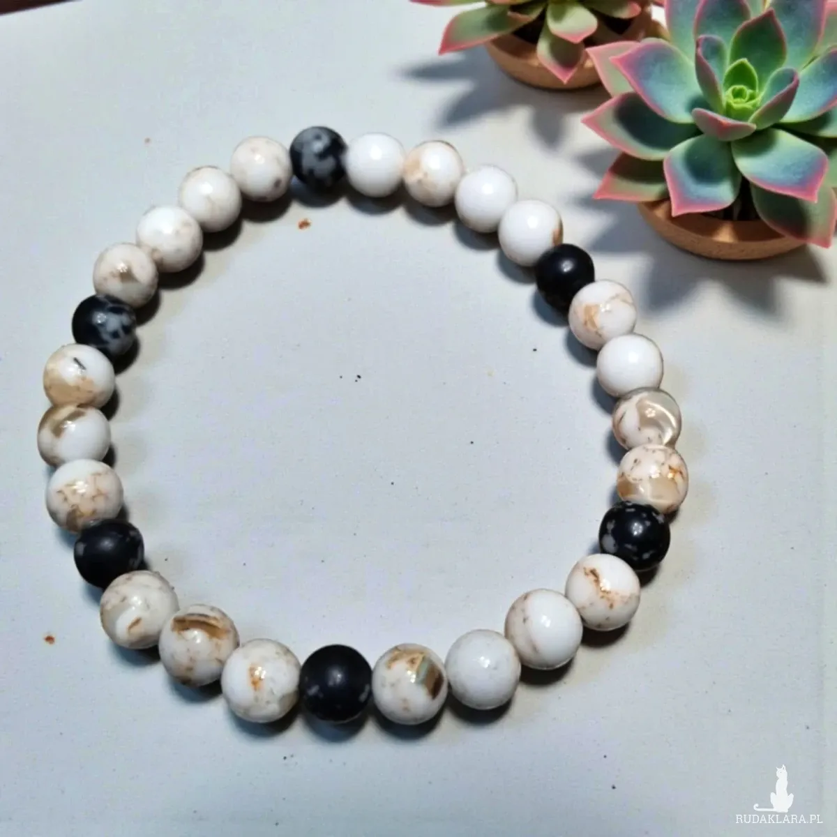 Bransoletka z naturalnych kamieni howlitu oraz obsydianu śnieżnego to elegancka i wyjątkowa biżuteria. Ciekawe kolory czeni z szarymi przetarciami oraz mlecznobiały z brązowo szarymi wstawkami dodają jej uroku.