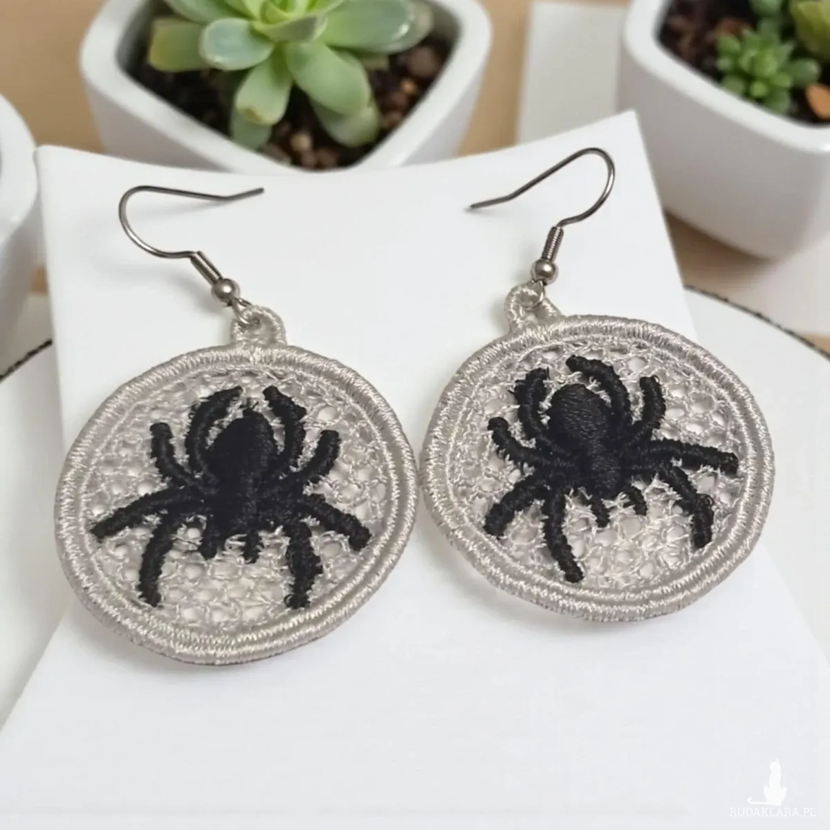 Haftowane szare kolczyki z pająkiem są delikatne i bardzo oryginalne. Z pewnością spodobają się kobietom ceniącym indywidualność oraz modne i nietuzinkowe stylizacje.