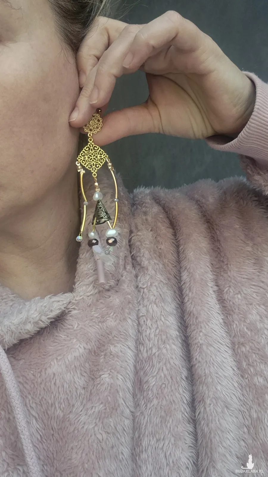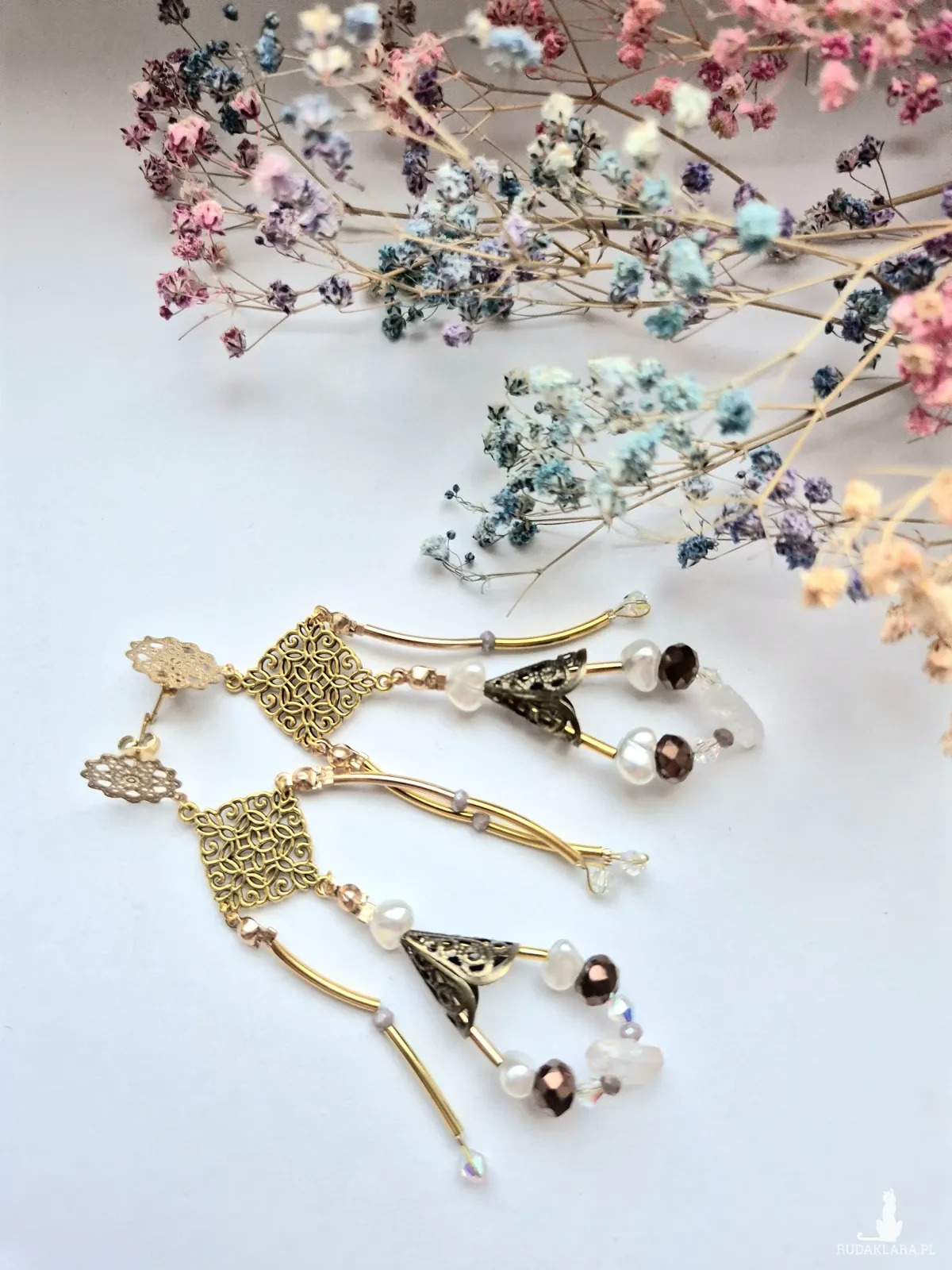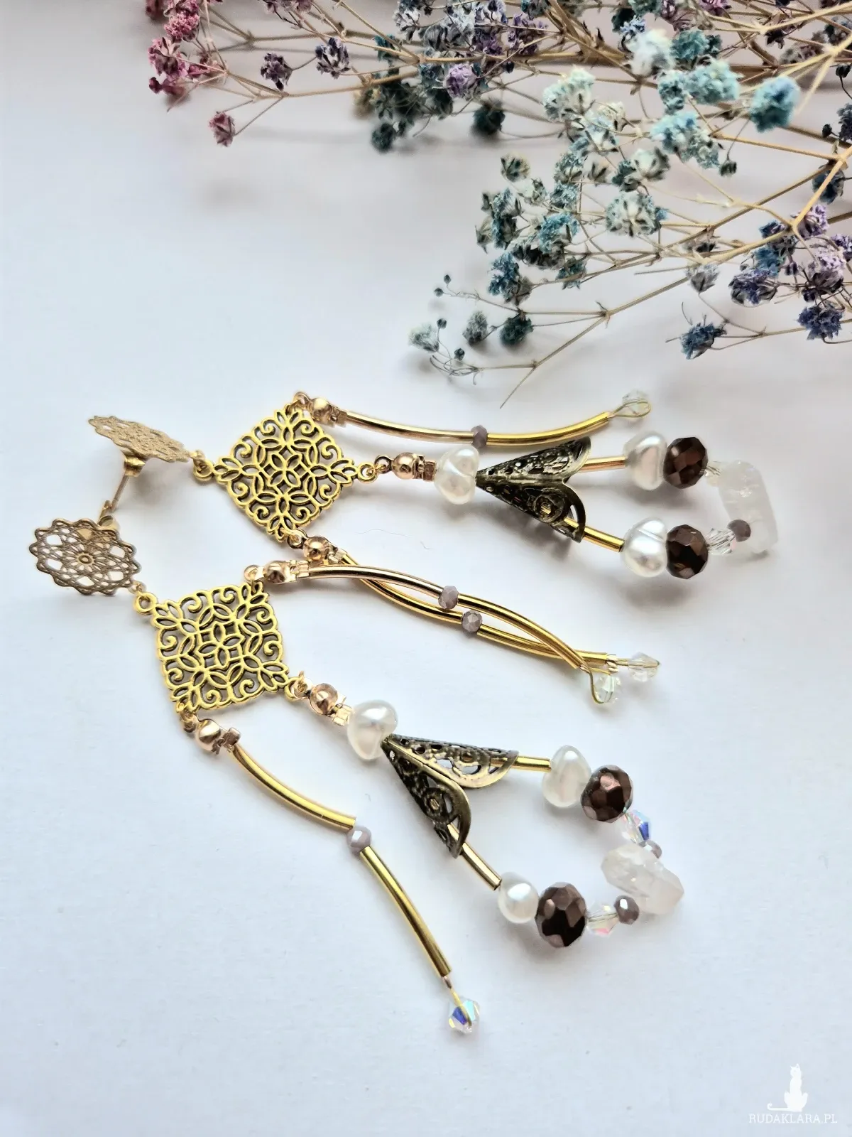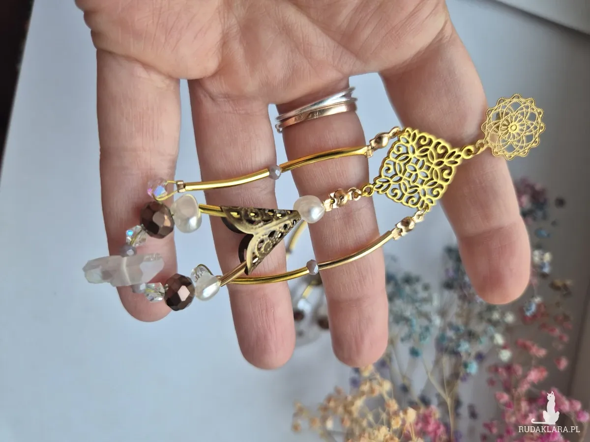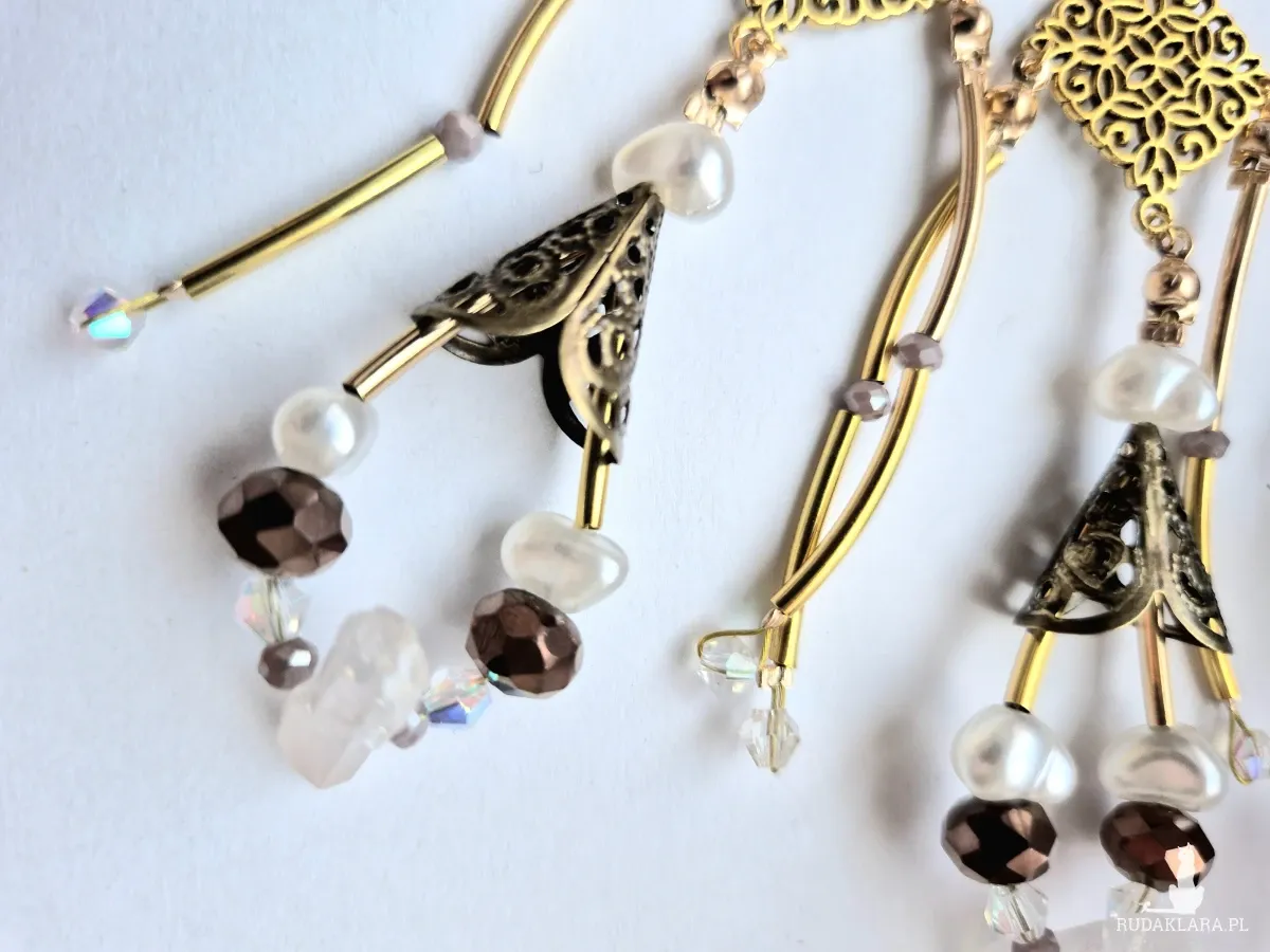 Kolczyki lekkie w kolorze złotym,elementy ze stali nierdzewnej, z koralikami i kryształem gorskim.Kryształ górski to bezbarwna odmiana kwarcu, ceniona za silne właściwości oczyszczające ciało, umysł i przestrzeń z negatywnej energii, działający jak "wzmacniacz" i "neutralizator". Wspiera koncentrację, jasność myśli, harmonię box x1
