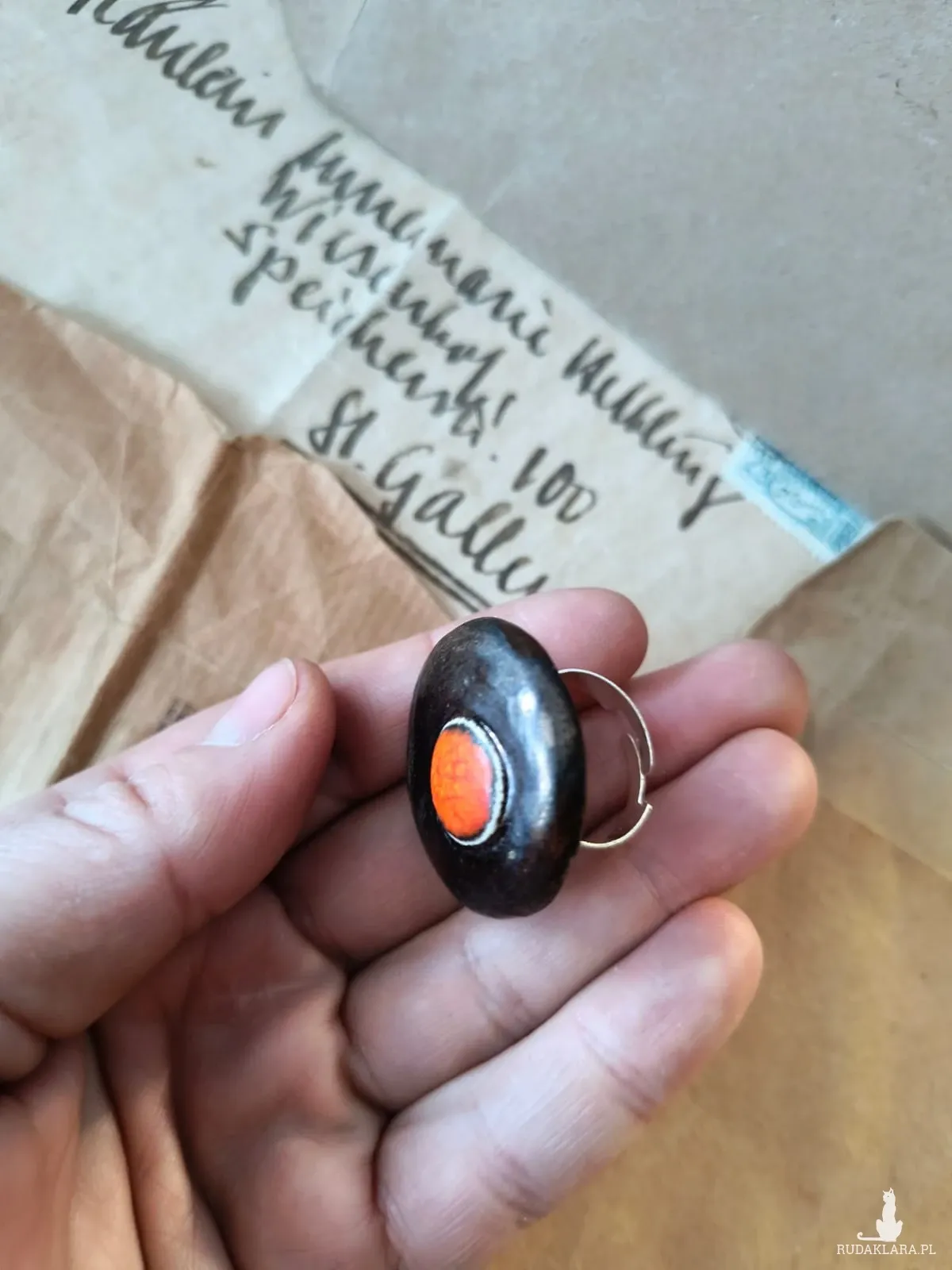 Pierścionek ceramiczny wykonany z gliny szamotowej, wypalony na biskwit, a następnie szkliwiony w temp. ok 1260 stopni C. Baza do pierścionka w kolorze srebra. Niepowtarzalny i jedyny w swoim rodzaju. Średnica ok 2,5 cm. Obwód pierścionka jest regulowany. Serdecznie polecam wszystkim Paniom!!!
