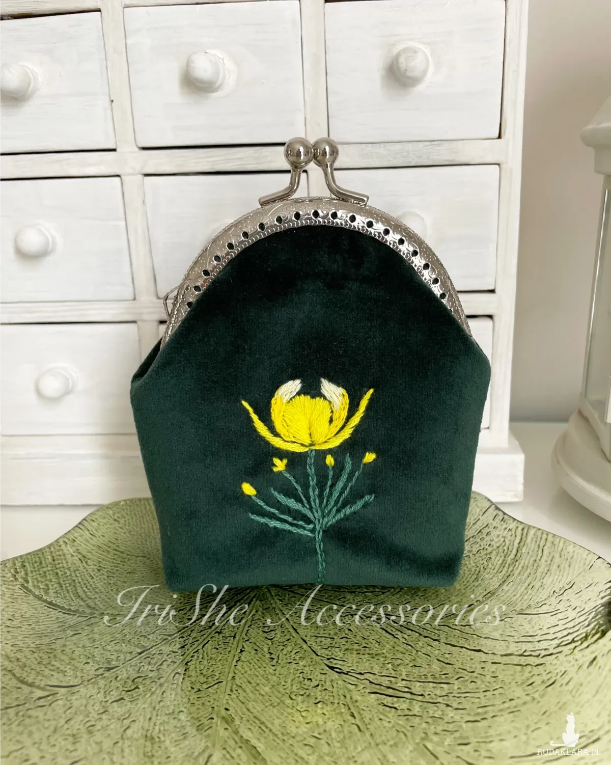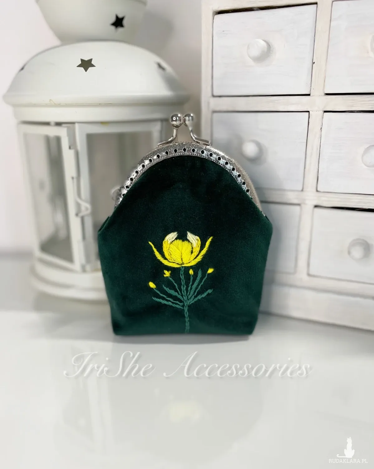 Welurowa portmonetka "Pełnik" w kolorze butelkowej zieleni uszyta i haftowana ręcznie. Portmonetka jest lekka, miękka i przyjemna w dotyku.