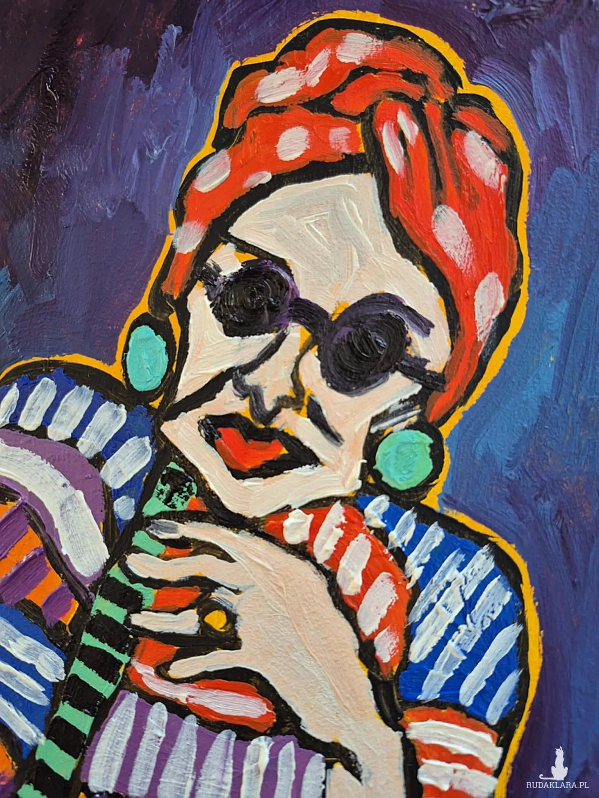 Centralną postacią jest kobieta o spokojnej, zamyślonej twarzy. Jej rysy są uproszczone, niemal maskowe — oczy ciemne, głębokie, zamknięte w sobie, usta czerwone, lekko wygięte w półuśmiechu. Głowę okala czerwona chusta w białe kropki, która nadaje jej charakteru i przywodzi na myśl ludową opowieść lub domowe ciepło. Duże, turkusowe kolczyki kontrastują z resztą kompozycji, przyciągając wzrok jak drobne akcenty światła.
