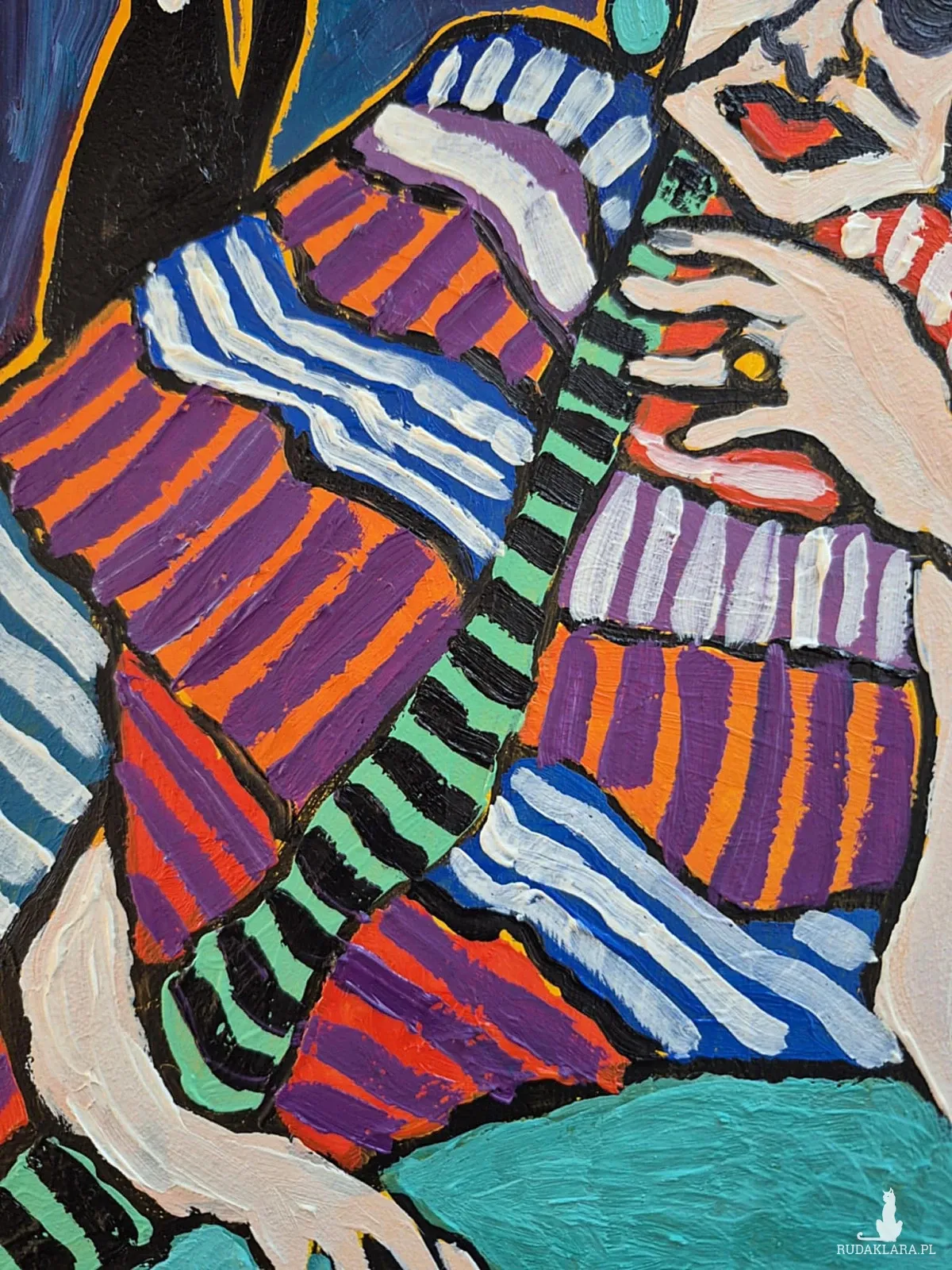 Postać ubrana jest w barwną, pasiastą suknię — rytmiczne pasy czerwieni, fioletu, błękitu, zieleni i bieli pulsują na płótnie, tworząc wrażenie ruchu i miękkości. Faktura farby jest wyraźna, gest pędzla odważny i szczery, co nadaje całości surową autentyczność. Kobieta opiera się o turkusową powierzchnię, jej dłoń wydaje się ciężka od myśli, jakby podtrzymywała nie tylko ciało, ale i nastrój chwili.