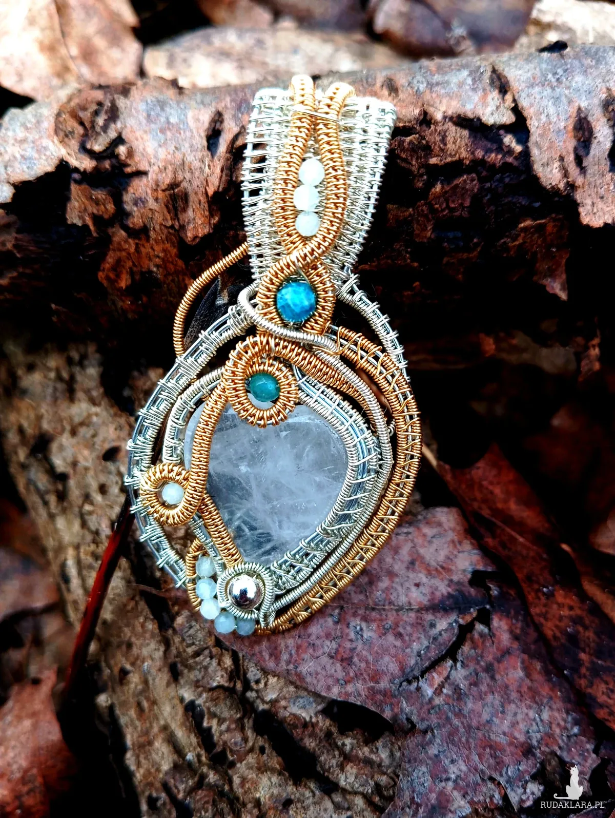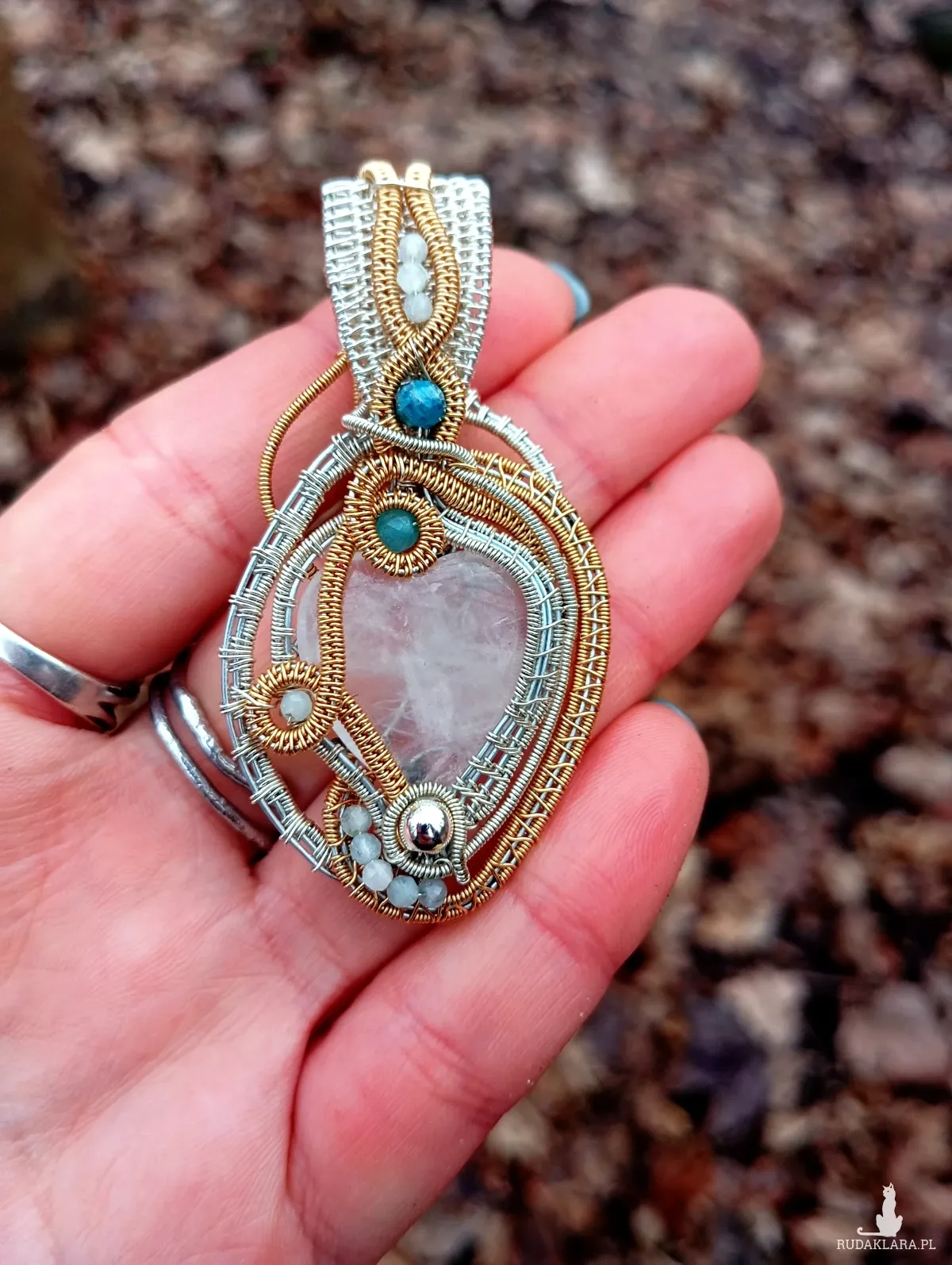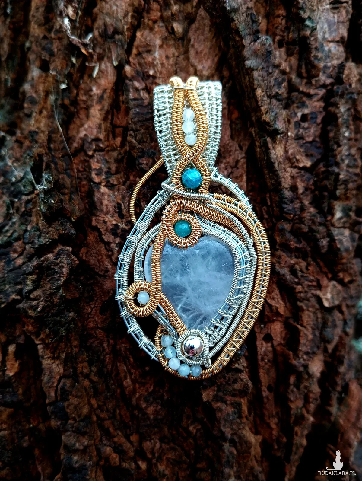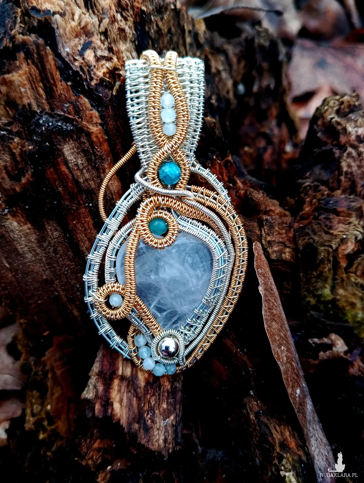 wykonana techniką wirewrappingu, złote i srebrne sploty zimowej aury, okalają