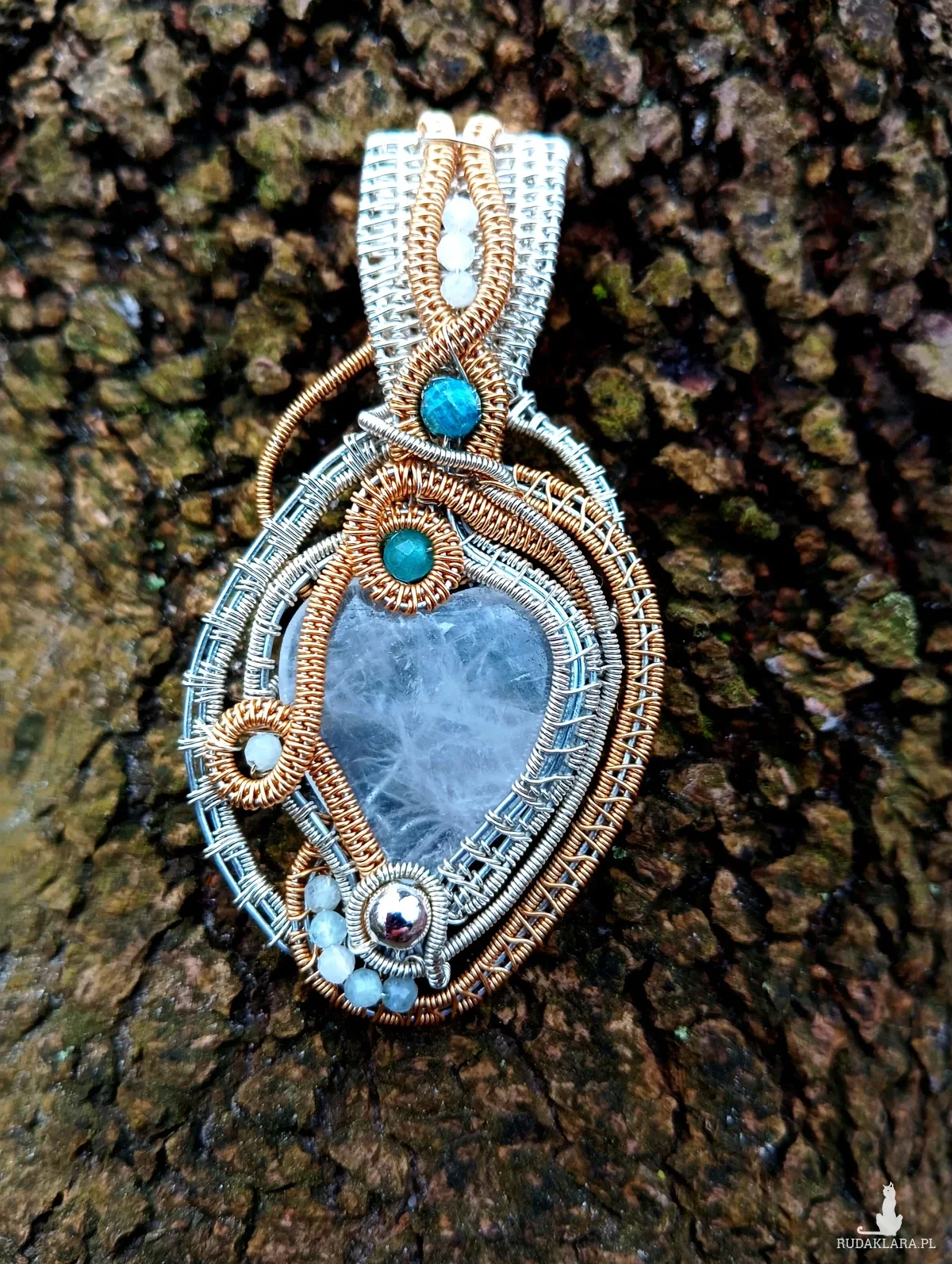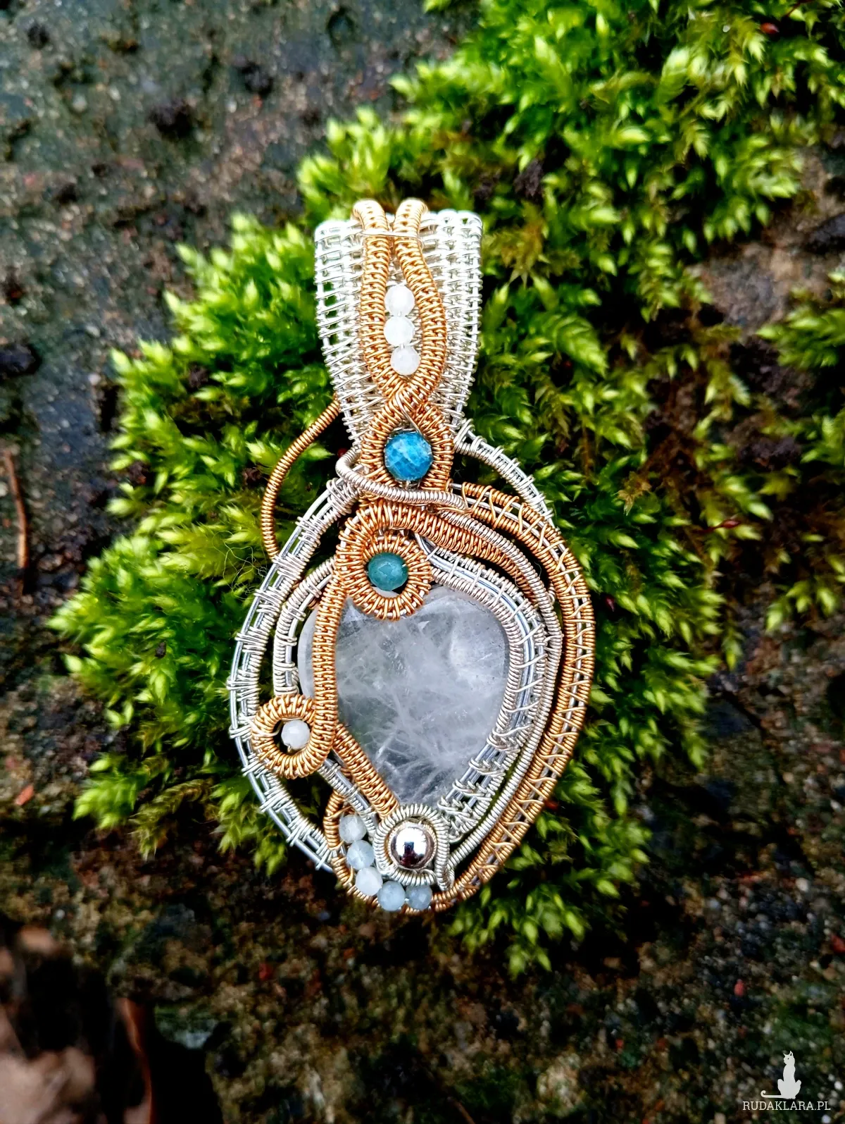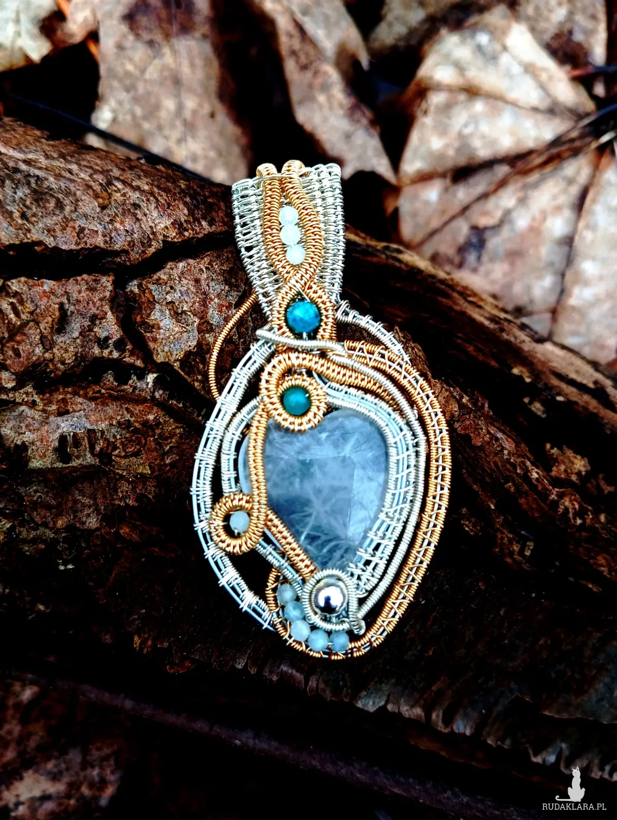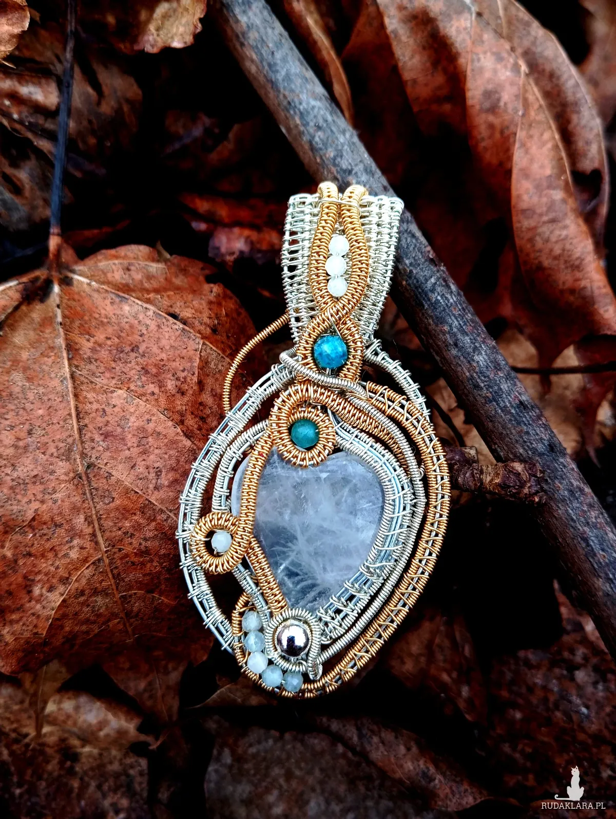 wykonana techniką wirewrappingu, złote i srebrne sploty zimowej aury, okalają
