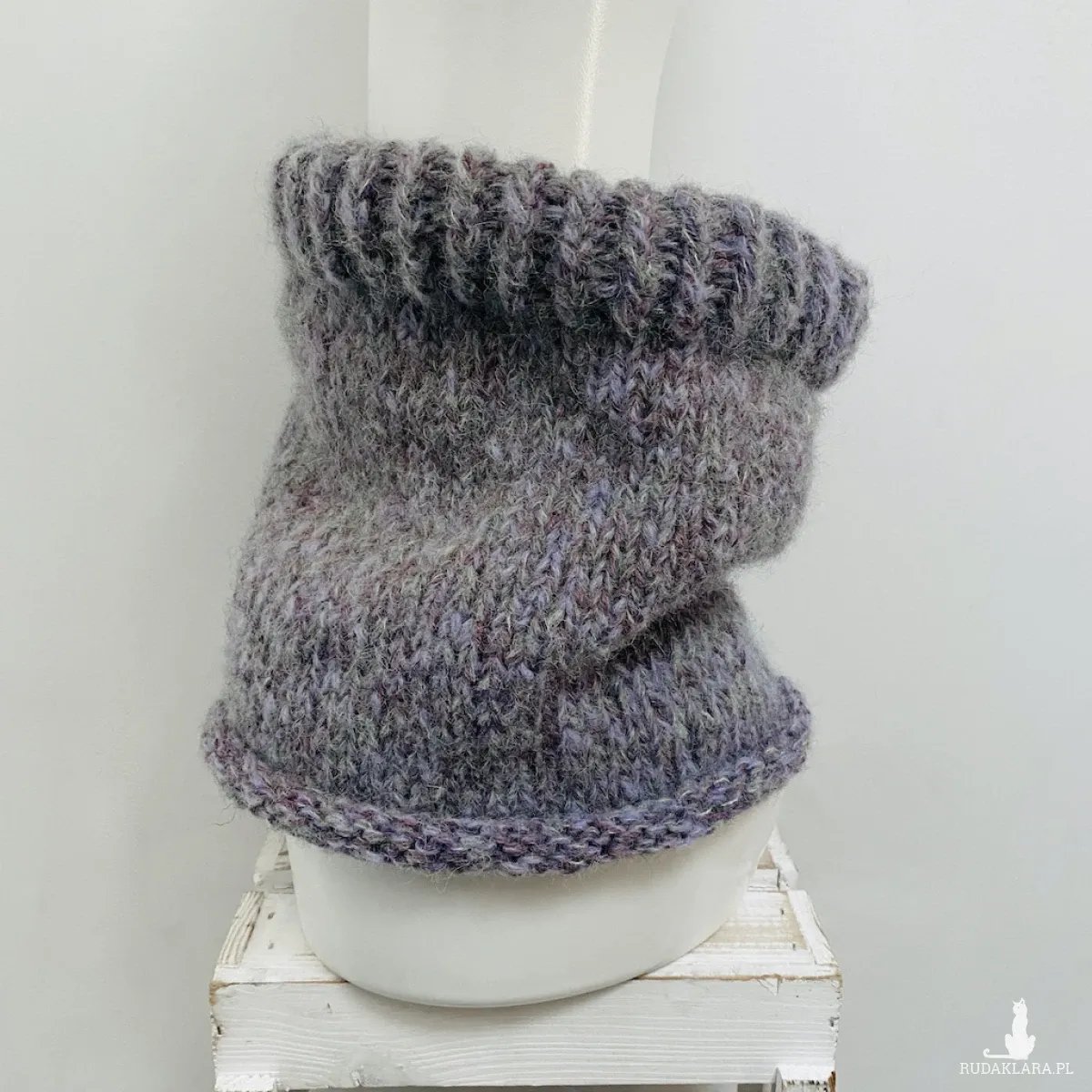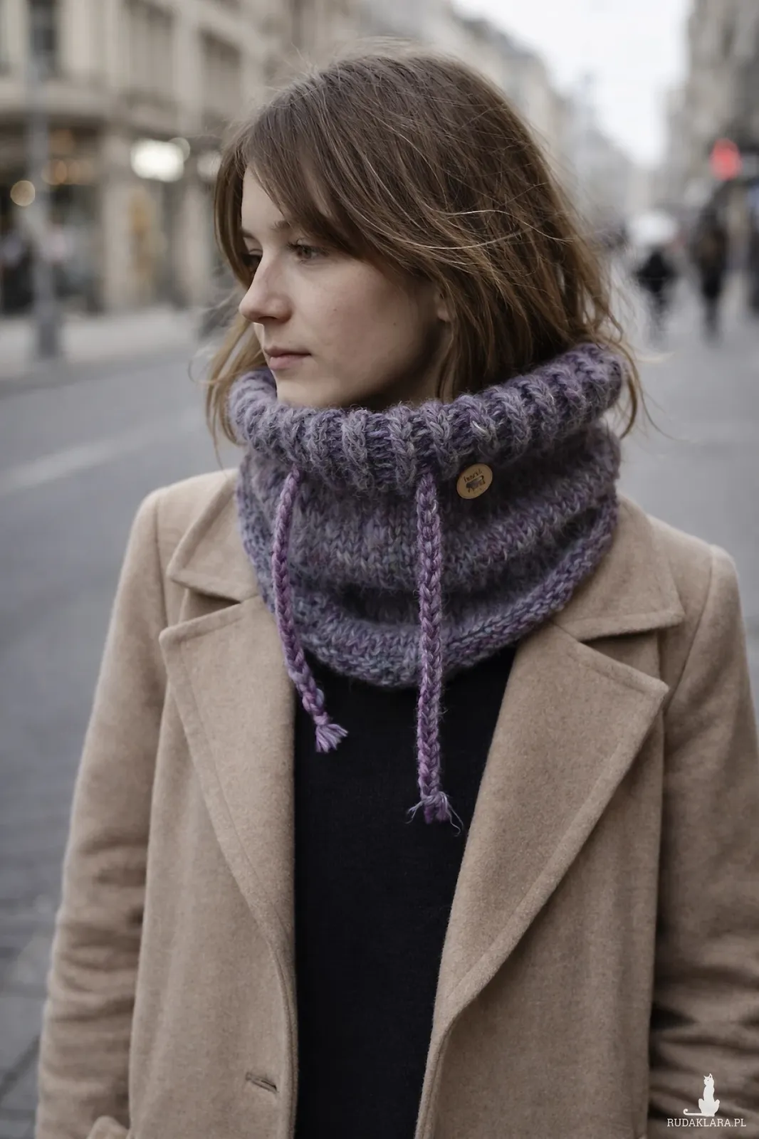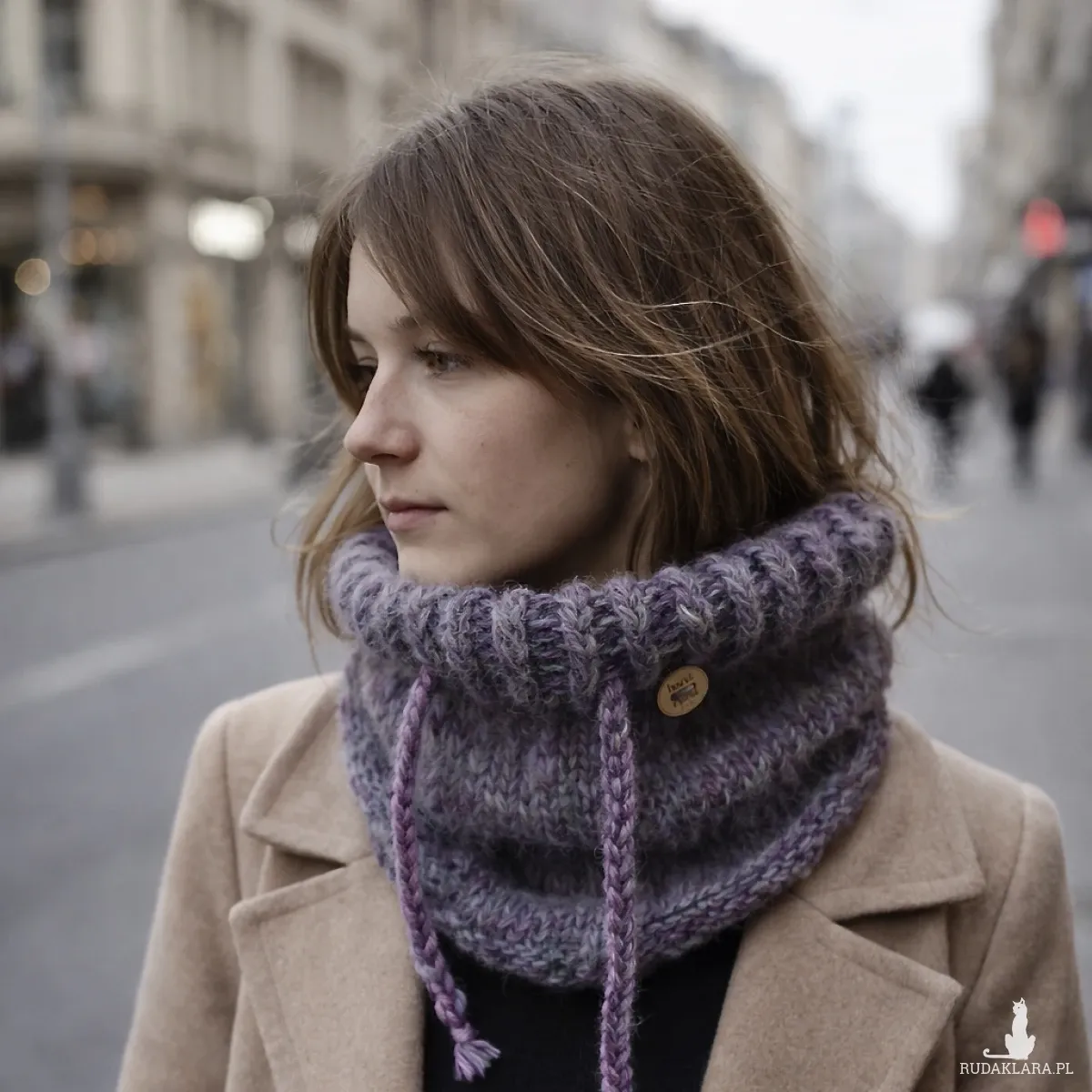 Otulacz ma wymiary 26 × 26 cm, co pozwala nosić go swobodnie lub lekko układać przy szyi. Górna krawędź została wykończona ściągaczem, który nadaje całości charakteru, poprawia dopasowanie i delikatnie chroni przed chłodem.