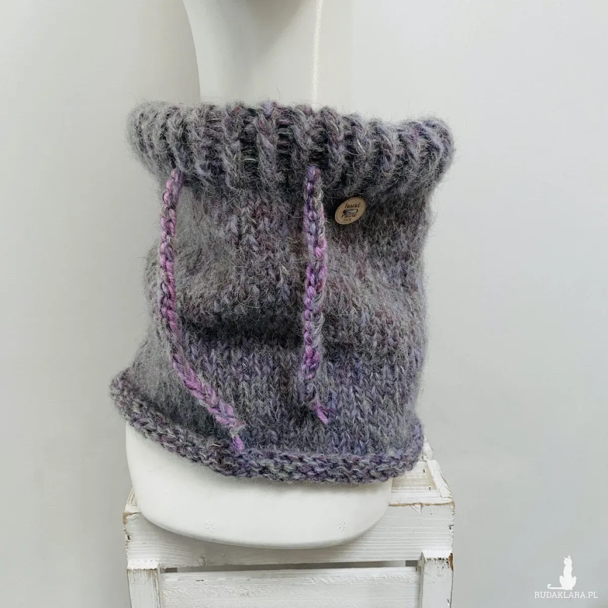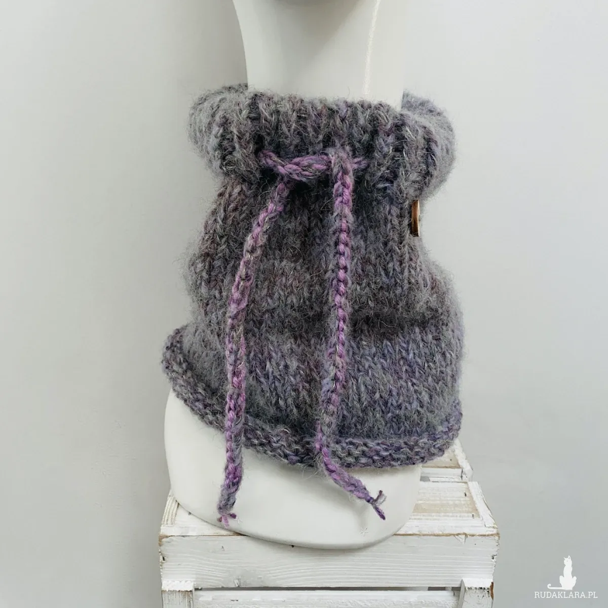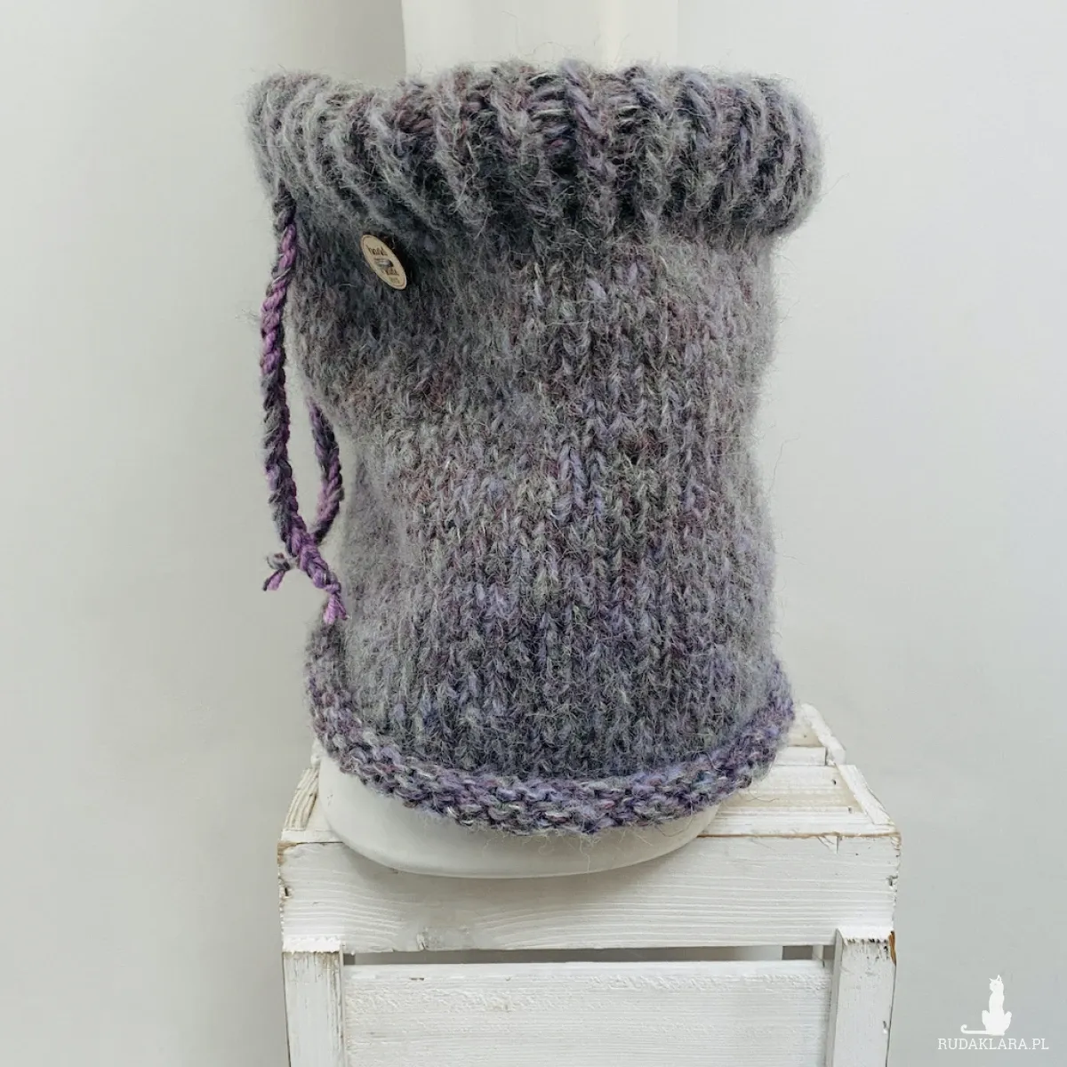 Otulacz ma wymiary 26 × 26 cm, co pozwala nosić go swobodnie lub lekko układać przy szyi. Górna krawędź została wykończona ściągaczem, który nadaje całości charakteru, poprawia dopasowanie i delikatnie chroni przed chłodem.