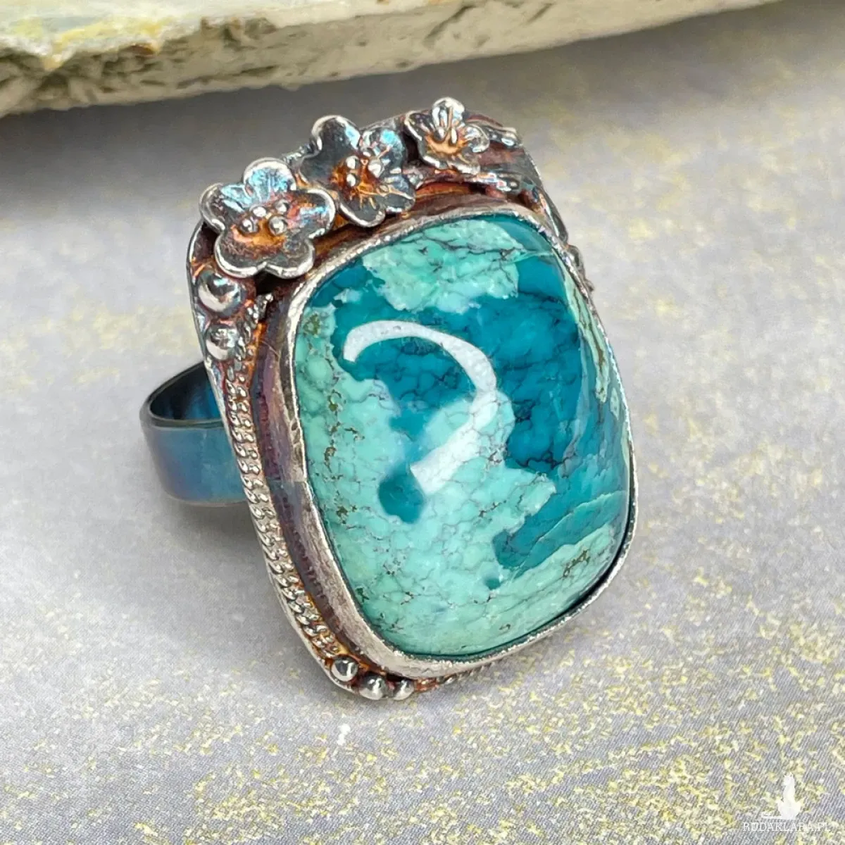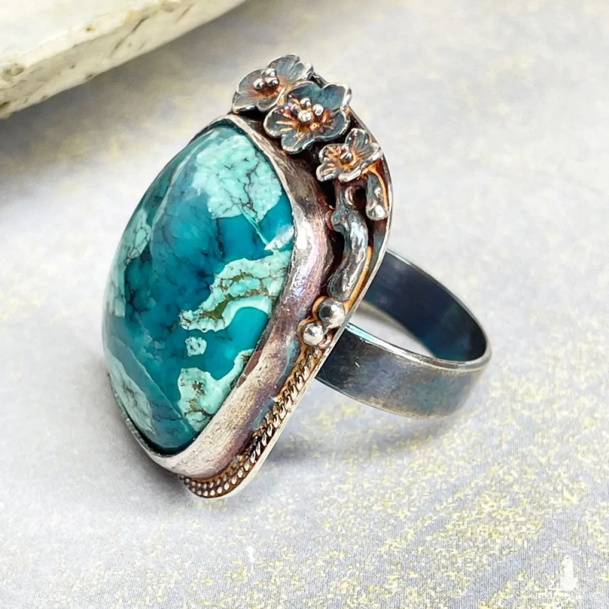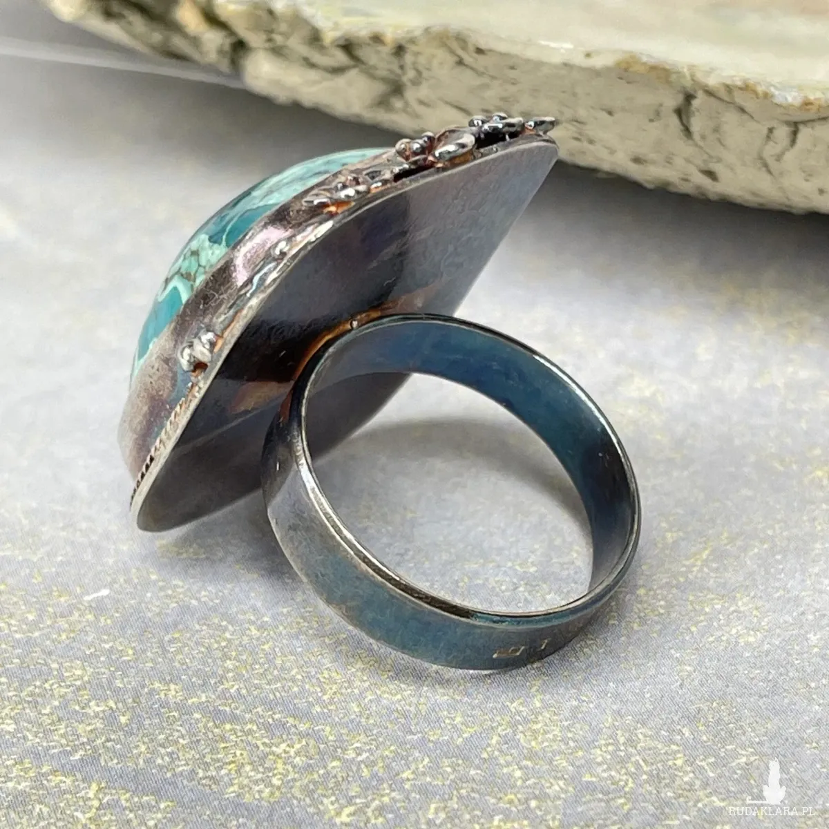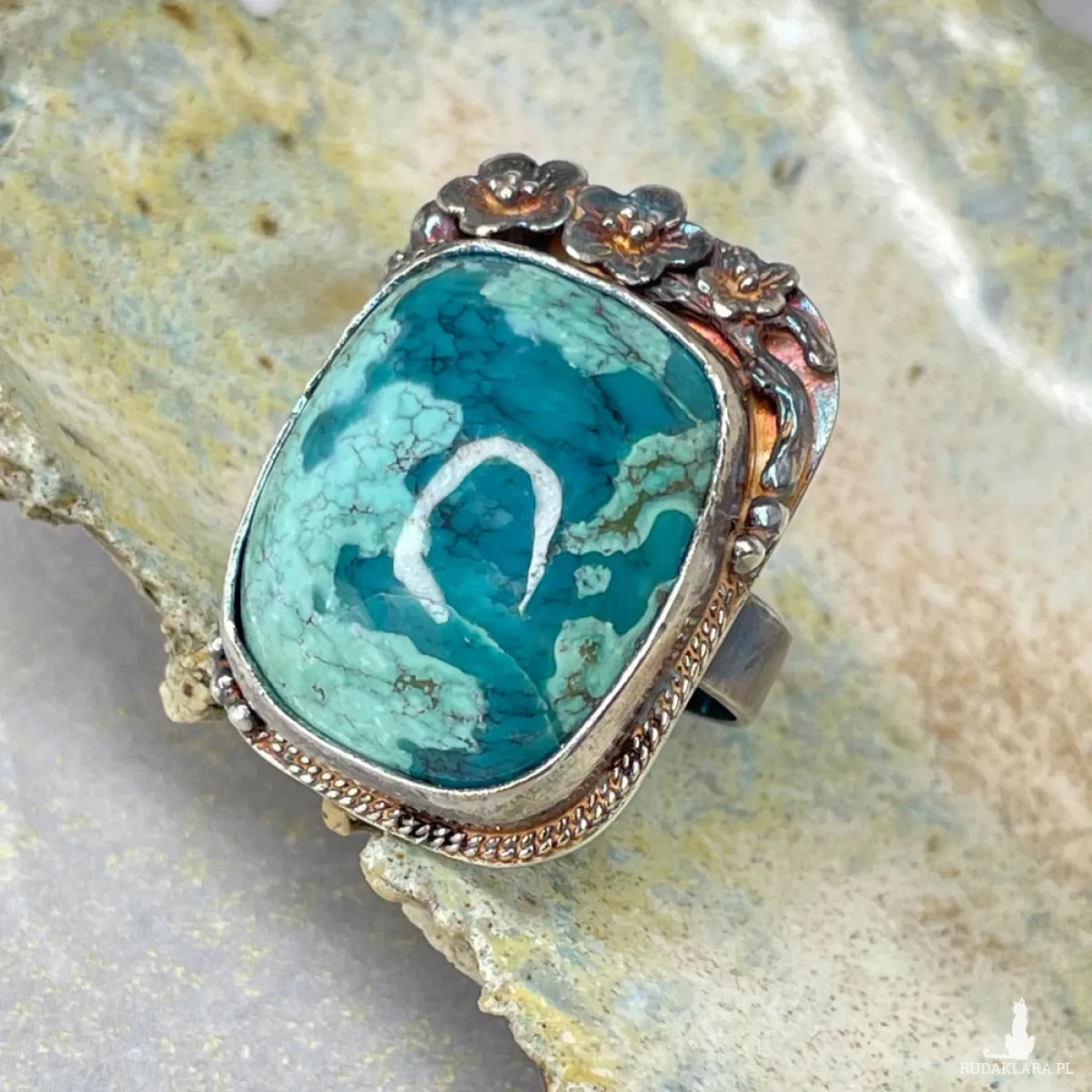 Srebrny pierścień z kwadratowym turkusem to wyrafinowane połączenie wyrazistej formy i subtelnej dekoracyjności. Centralnie osadzony kamień o geometrycznym kształcie przyciąga uwagę intensywną barwą, a jego oprawę otaczają oksydowane, florystyczne detale, które dodają całości głębi i artystycznego charakteru. Kontrast między chłodnym srebrem, przyciemnionymi kwiatami i gładką powierzchnią kamienia tworzy kompozycję inspirowaną estetyką vintage, z delikatną nutą romantyzmu. To pierścień dla osób poszukujących biżuterii z charakterem — eleganckiej, nieoczywistej i ponadczasowej. Ważne informacje: Materiał: srebro próby 925, turkus Wielkość kamienia: 13 mm Wielkość korony: 22×20 mm Waga pierścionka: 14,14 g Waga srebra: 8,51 g Obrączka rozmiar: 18 Biżuteria zostanie elegancko zapakowana. Kolory na zdjęciach mogą delikatnie różnić się od rzeczywistych.