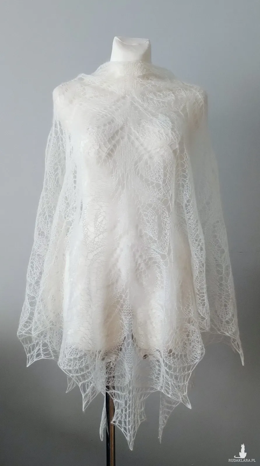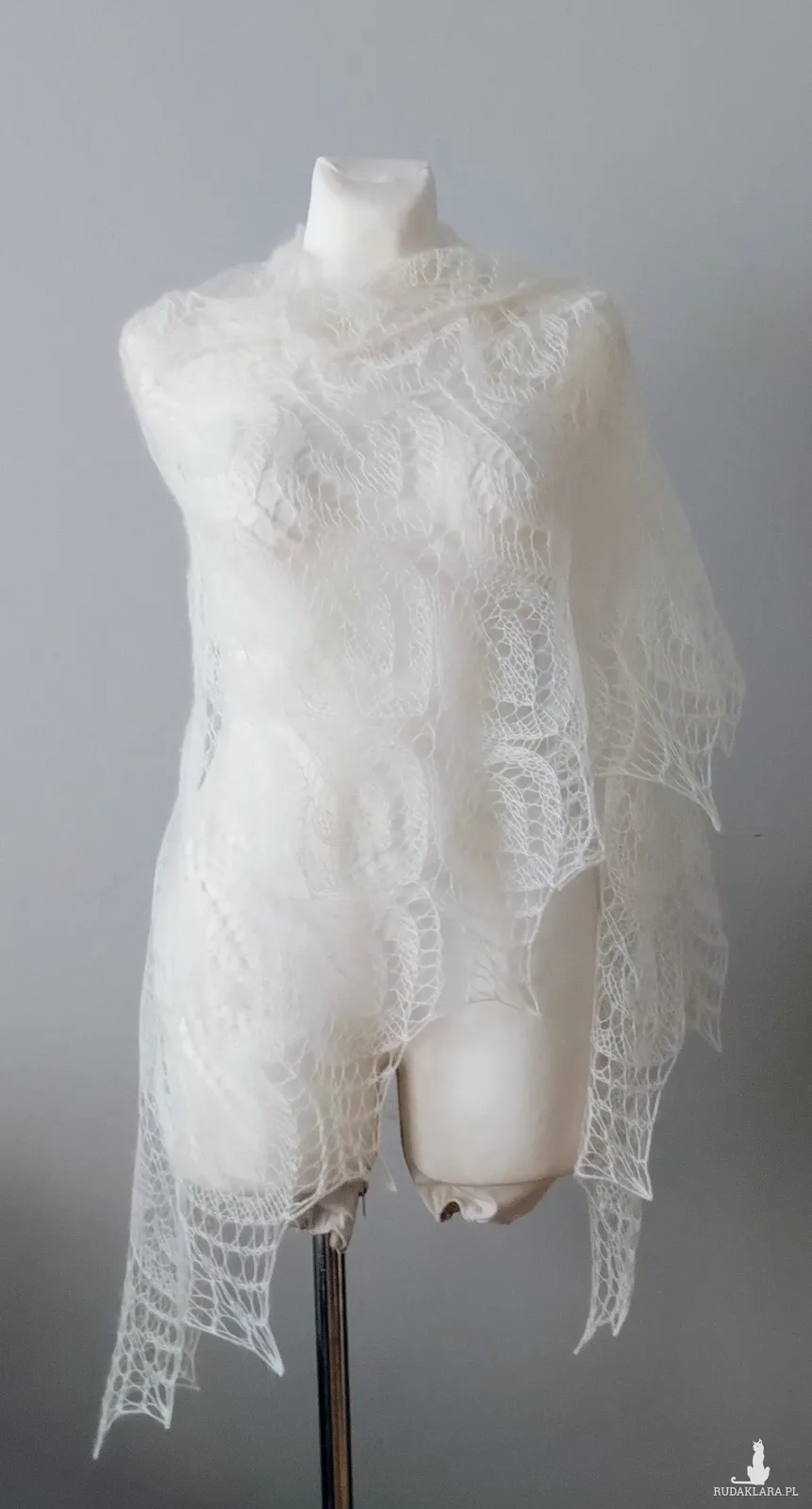 z mieszanki alpaki,moheru i akrylu w kolorze śmietanki.Chusta mgiełka.Wymiary: szerokość 230cm, długość 110 cm. Prać ręcznie w temperaturze 30 stopni, suszyć na leżąco .