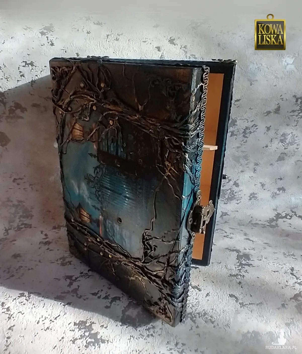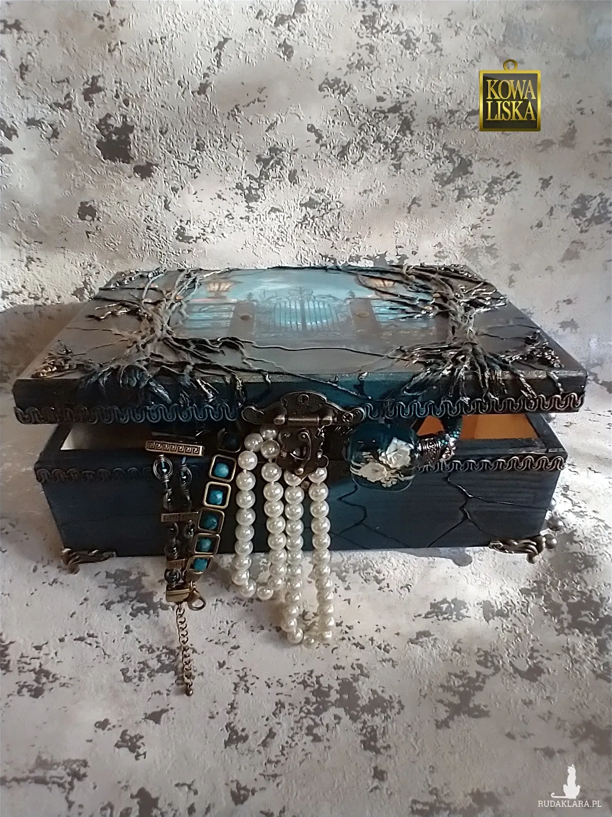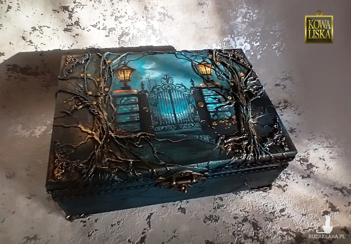 Namalowany na wieczku mroczny obrazek uzupełniony i zdobiony ręcznie, sprawdzoną autorską metodą "co się nawinie, a oko zatwierdzi" - dlatego każda skrzyneczka jest absolutnie wyjątkowa i jedyna w swoim rodzaju.