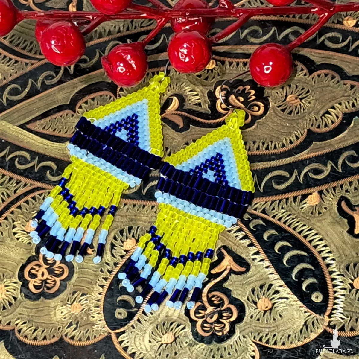 Ręcznie wykonane kolczyki z drobnych koralików w świeżej, energetycznej kolorystyce. Połączenie żółtego, jasnego fioletu i chabrowego granatu tworzy nowoczesny, a jednocześnie etniczny wzór inspirowany stylem boho i folk.Geometryczna forma oraz delikatne