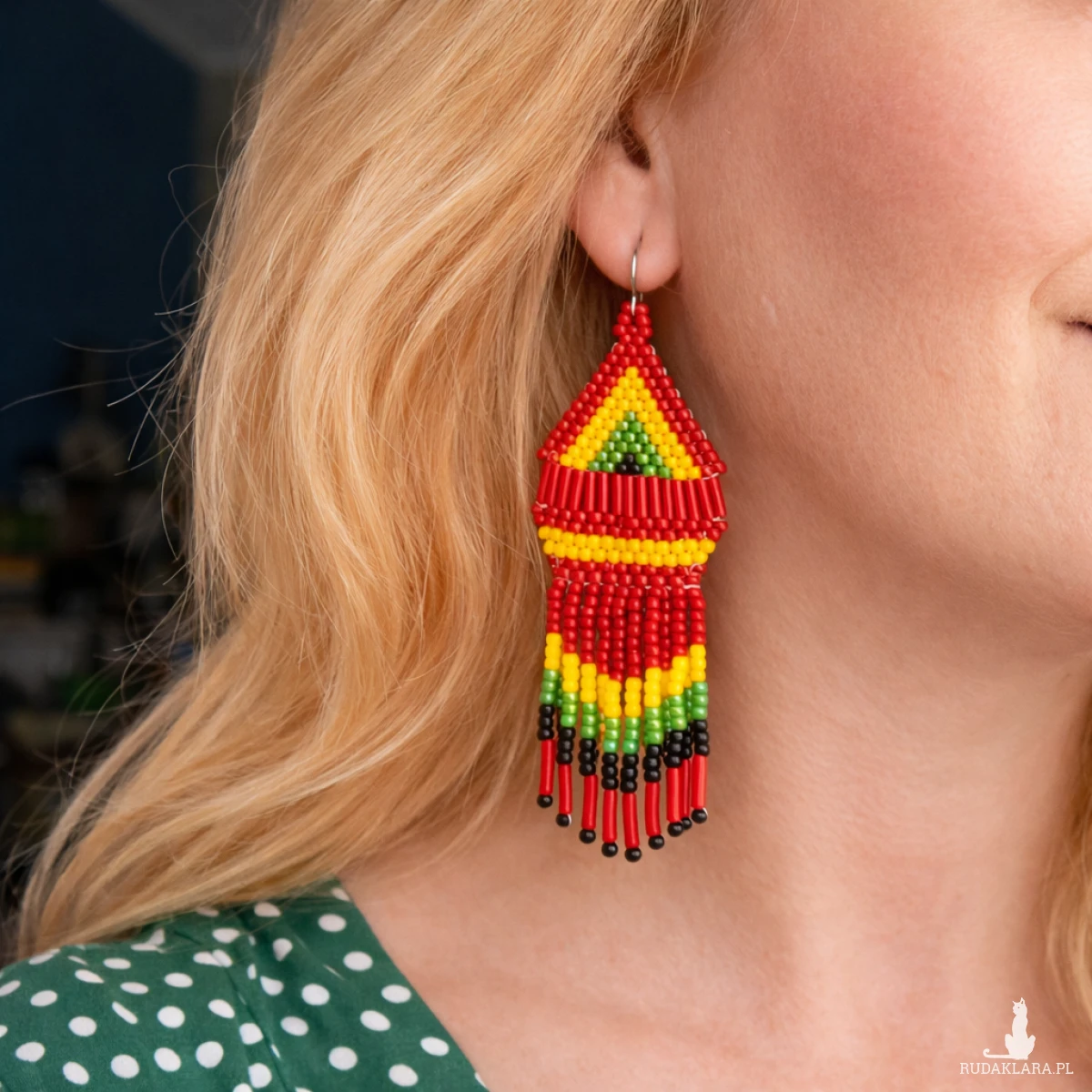 Wyraziste kolczyki etno z koralików ręcznie robione w stylu boho i rasta. Intensywne kolory czerwieni, żółci i zieleni oraz geometryczny wzór nadają biżuterii charakteru i oryginalności. Idealny dodatek do stylizacji festiwalowych, etnicznych i codziennych.