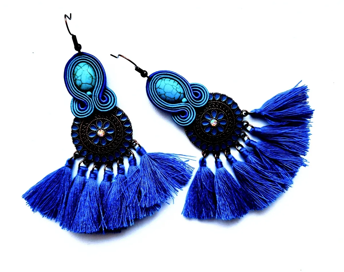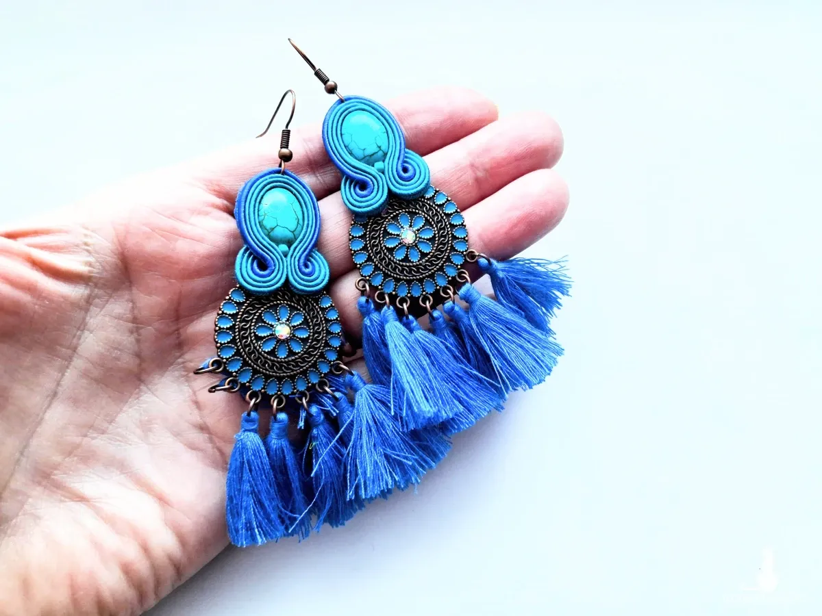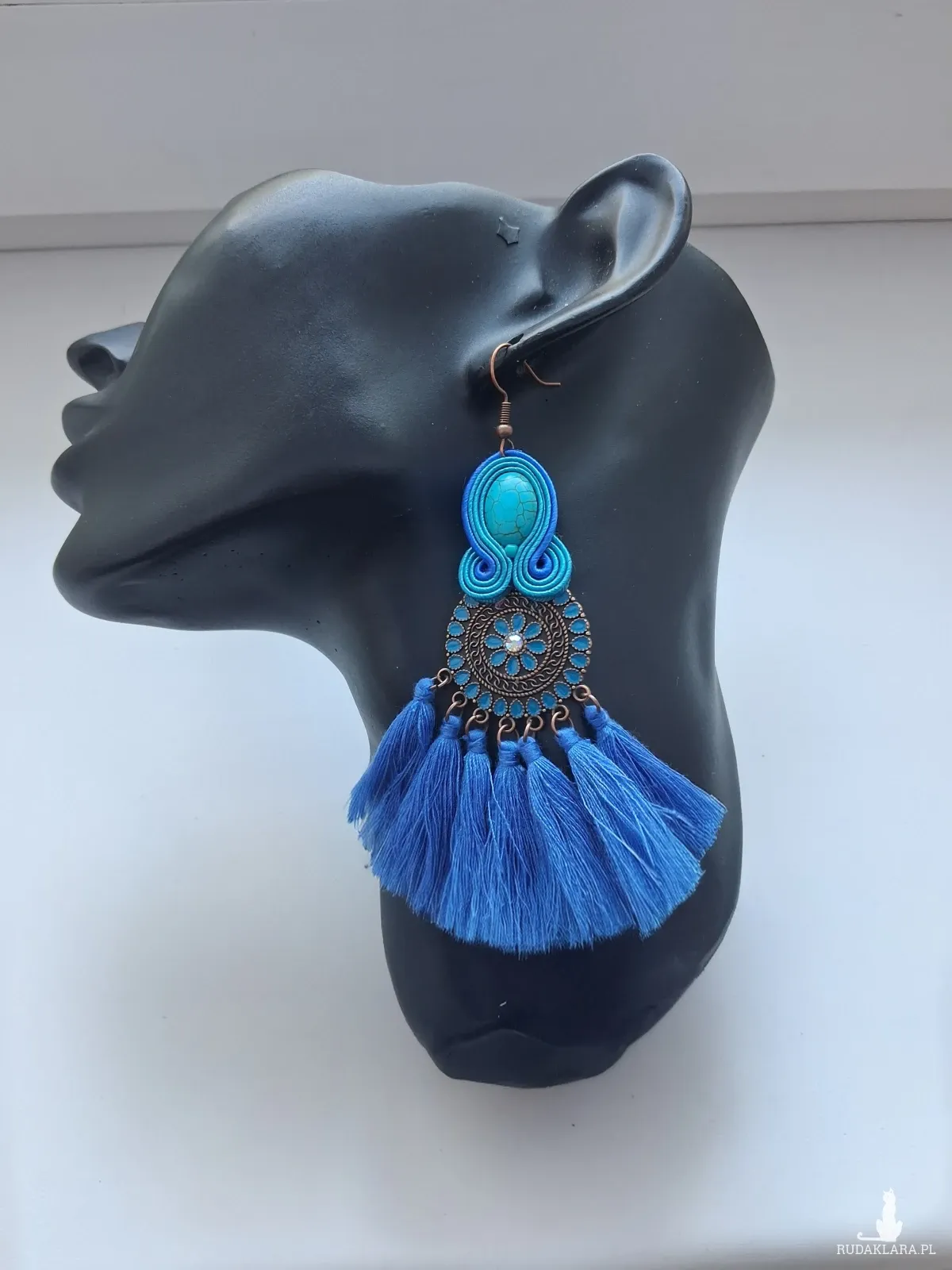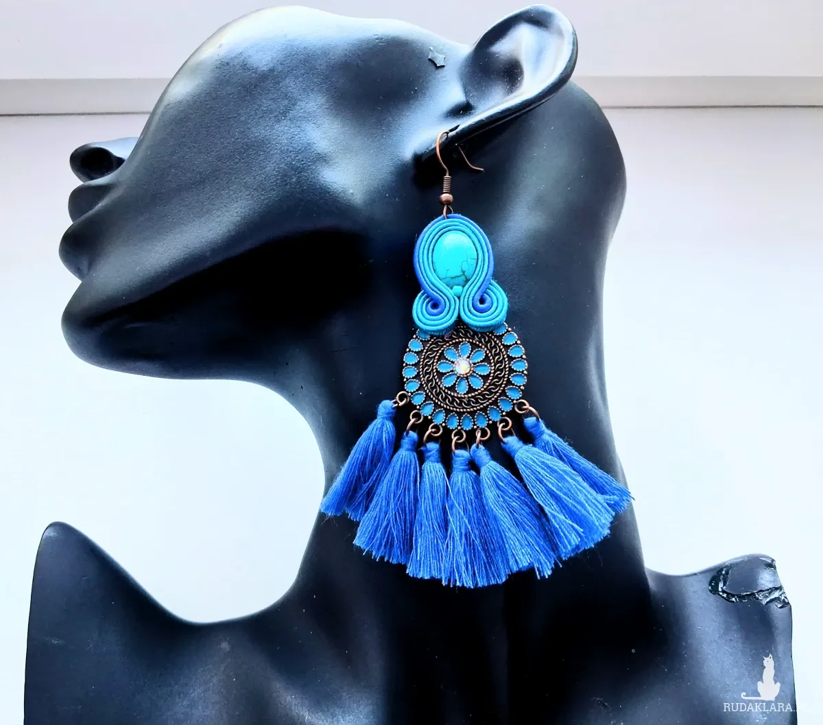 Materiał: turkusowy howlit, metal, bawełniane chwosty, sutasz.