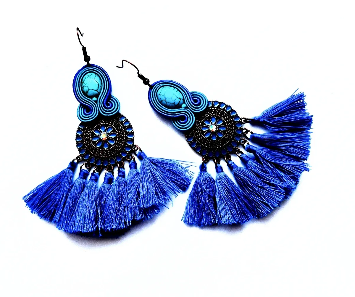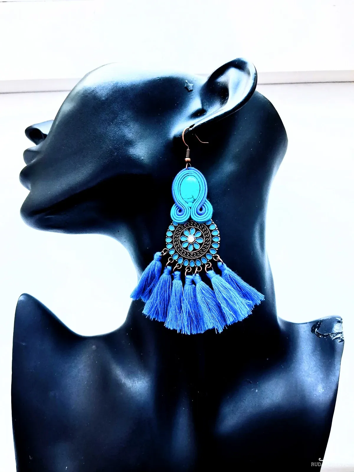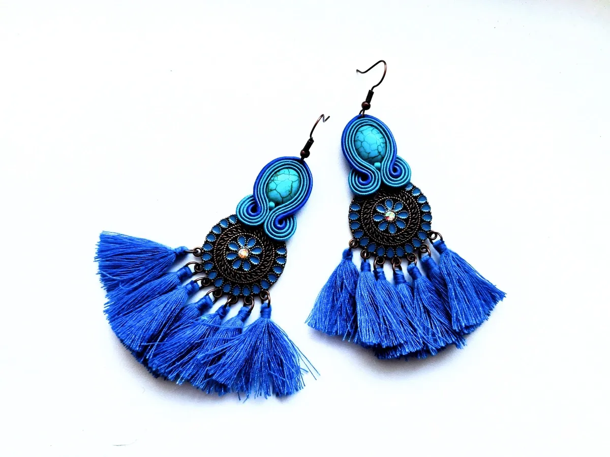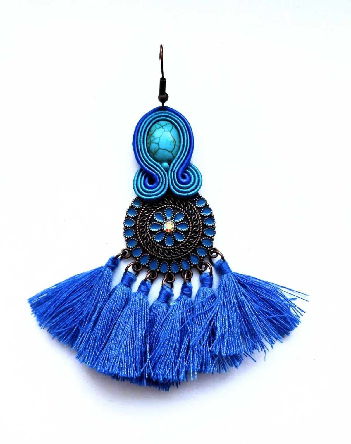 Materiał: turkusowy howlit, metal, bawełniane chwosty, sutasz.