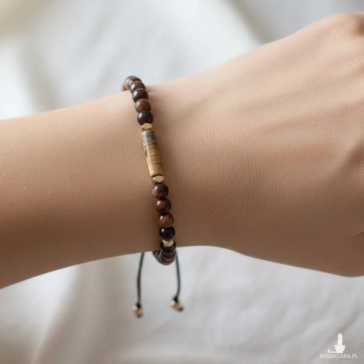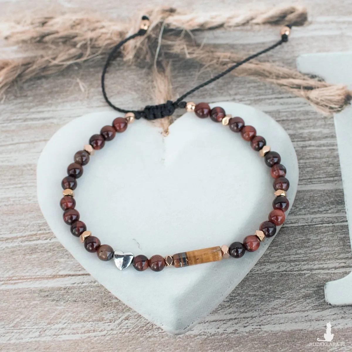 Bransoletkę wysyłam zapakowaną w kartonową kopertkę przewiązaną lnianą nicią i woreczek z organzy, z dołączoną etykietą opisową.