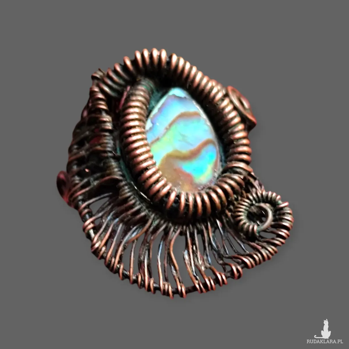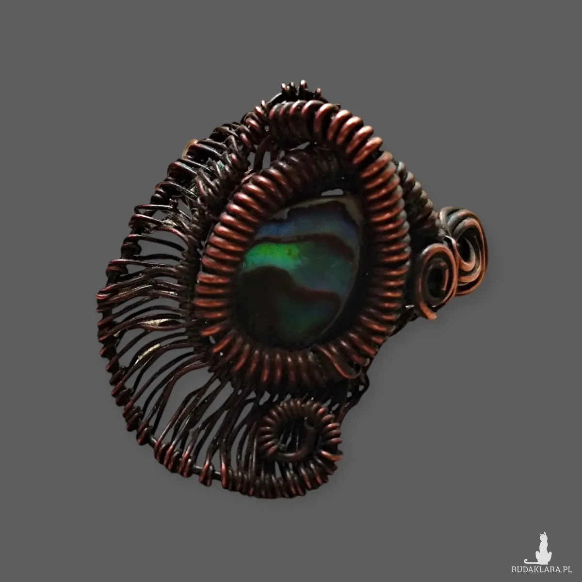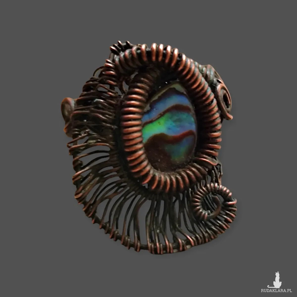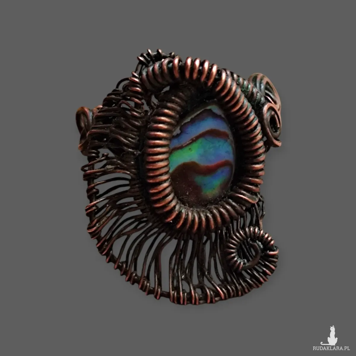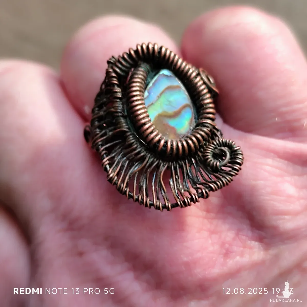 Ten unikatowy, ręcznie wykonany pierścionek to prawdziwe dzieło sztuki. Centralnym elementem jest owalna muszla Paua, znana również jako Abalone, której wnętrze mieni się bajecznymi, tęczowymi kolorami. Otoczono ją precyzyjnie wykonaną, oksydowaną miedzią w technice wire wrapping, która nadaje biżuterii postarzany, nieco industrialny charakter. Pierścionek jest jedyny w swoim rodzaju, a układ kolorów w muszli jest absolutnie Rozmiar 20