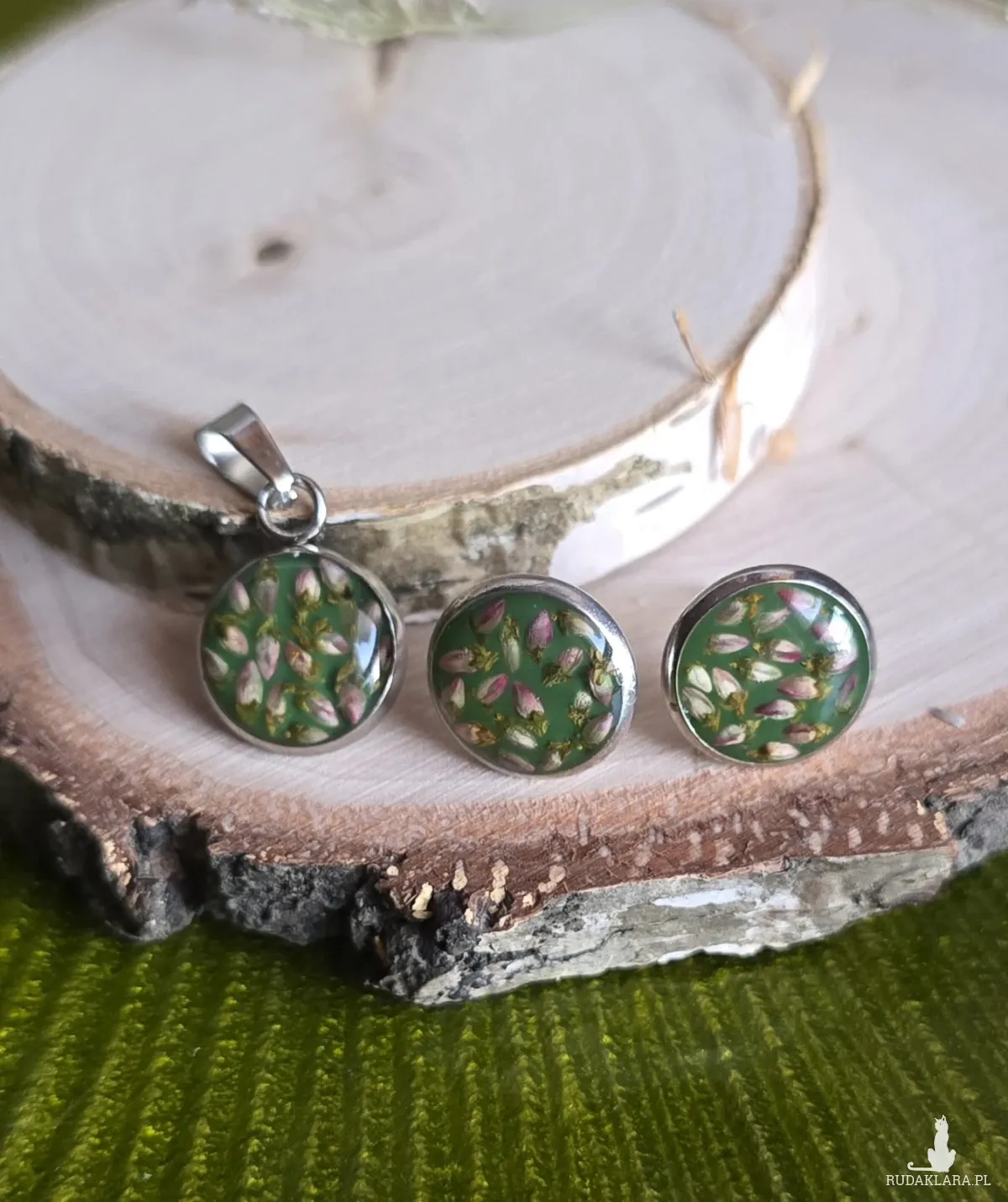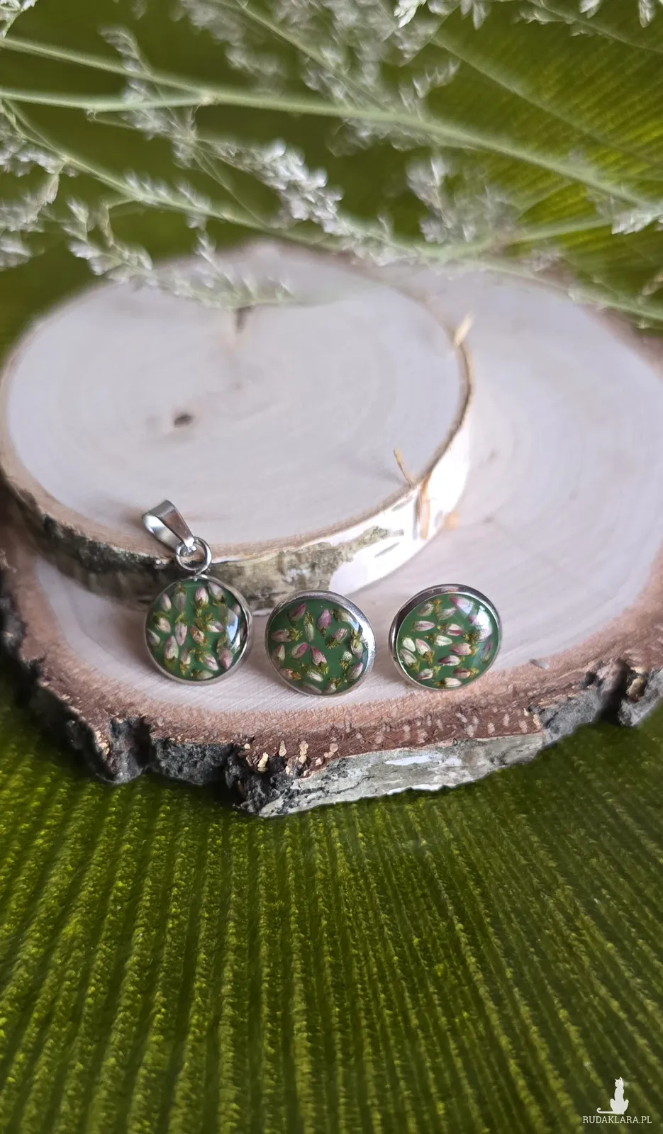 Oferuję Państwu unikalną biżuterię. Komplet jest wykonany z suszonych kwiatów i żywicy epoksydowej. Biżuteria jest wspaniałym i oryginalnym prezentem na lata.