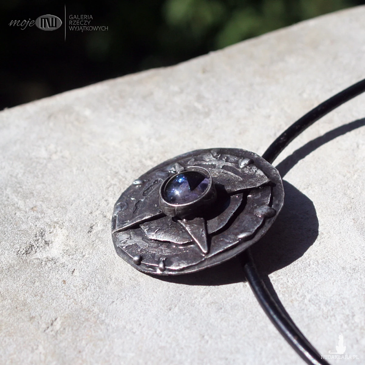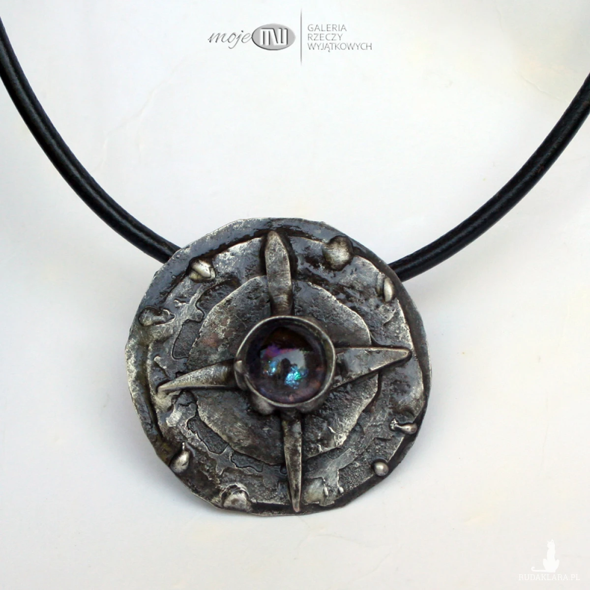 Miedziany wisior w kształcie róży wiatrów - zrobiłam go z trawionej miedzi, pokrytej cyną, spatynowanej i przetartej dla wydobycia szczegółów. W centralnym punkcie jest szklany kaboszon, który wytopiłam metodą fusingu. Wisior zawieszony jest na czarnym skórzanym rzemieniu 3 mm o długości ok. 50 cm
