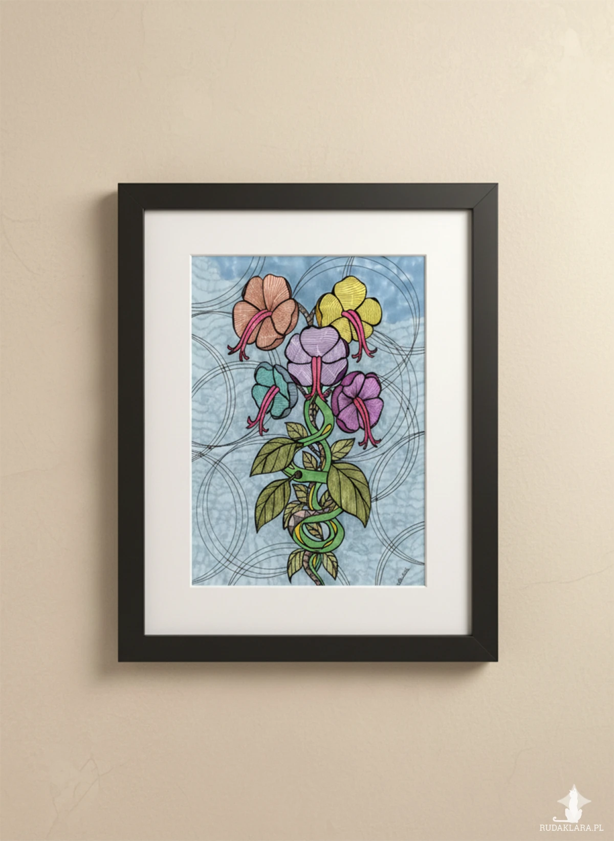 Najlepiej zaprezentuje się w prostej ramie, która nie odciągnie uwagi od misternego splotu „żmijowej” łodygi.