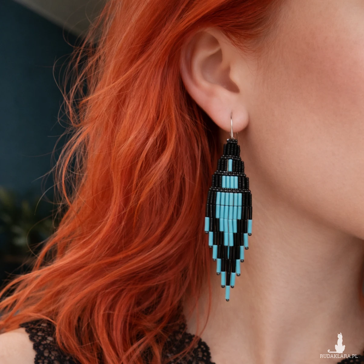 Kolczyki Ticala to ręcznie wykonana biżuteria z drobnych koralików, która łączy elegancki turkus z głęboką czernią. Smukła forma i długie frędzle nadają im lekkości oraz subtelnego ruchu, dzięki czemu kolczyki pięknie prezentują się podczas noszenia.