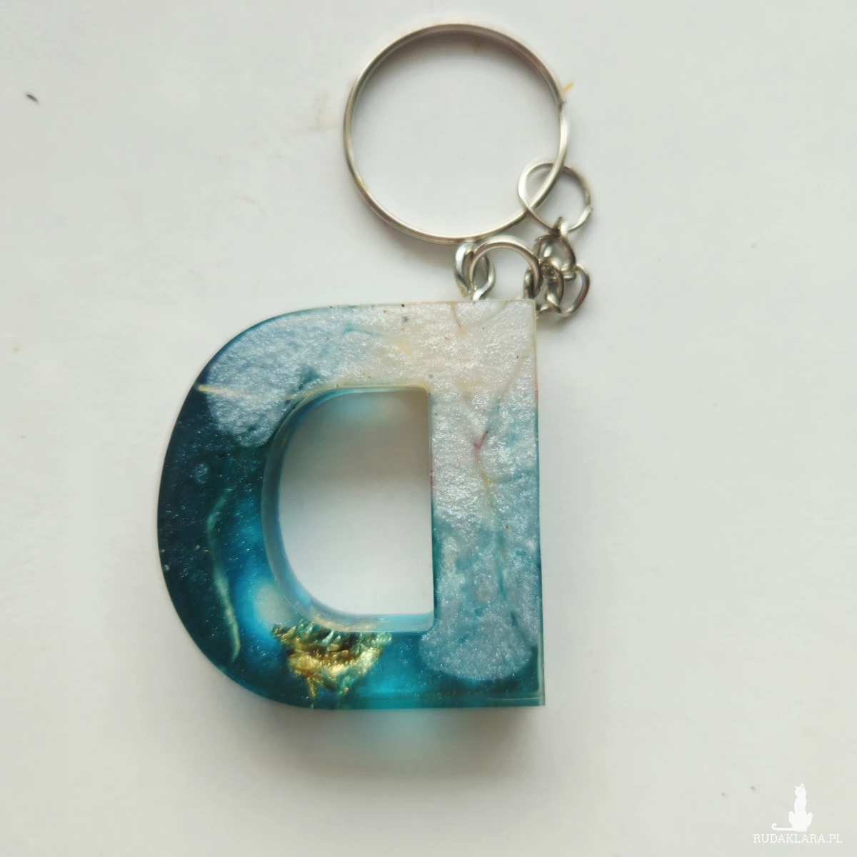 Brelok literka D morska z brokatem i płatkami kwiatów