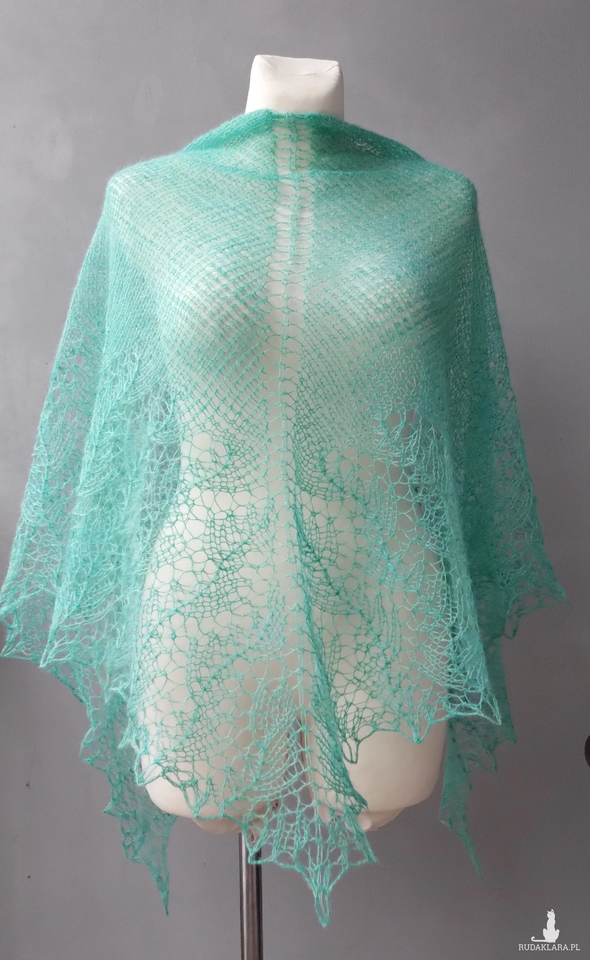 z mieszanki wełny,moheru i akrylu w kolorze turkusowym.Chusta mgiełka.Wymiary: szerokość 210cm, długość 95 cm. Prać ręcznie w temperaturze 30 stopni, suszyć na leżąco .