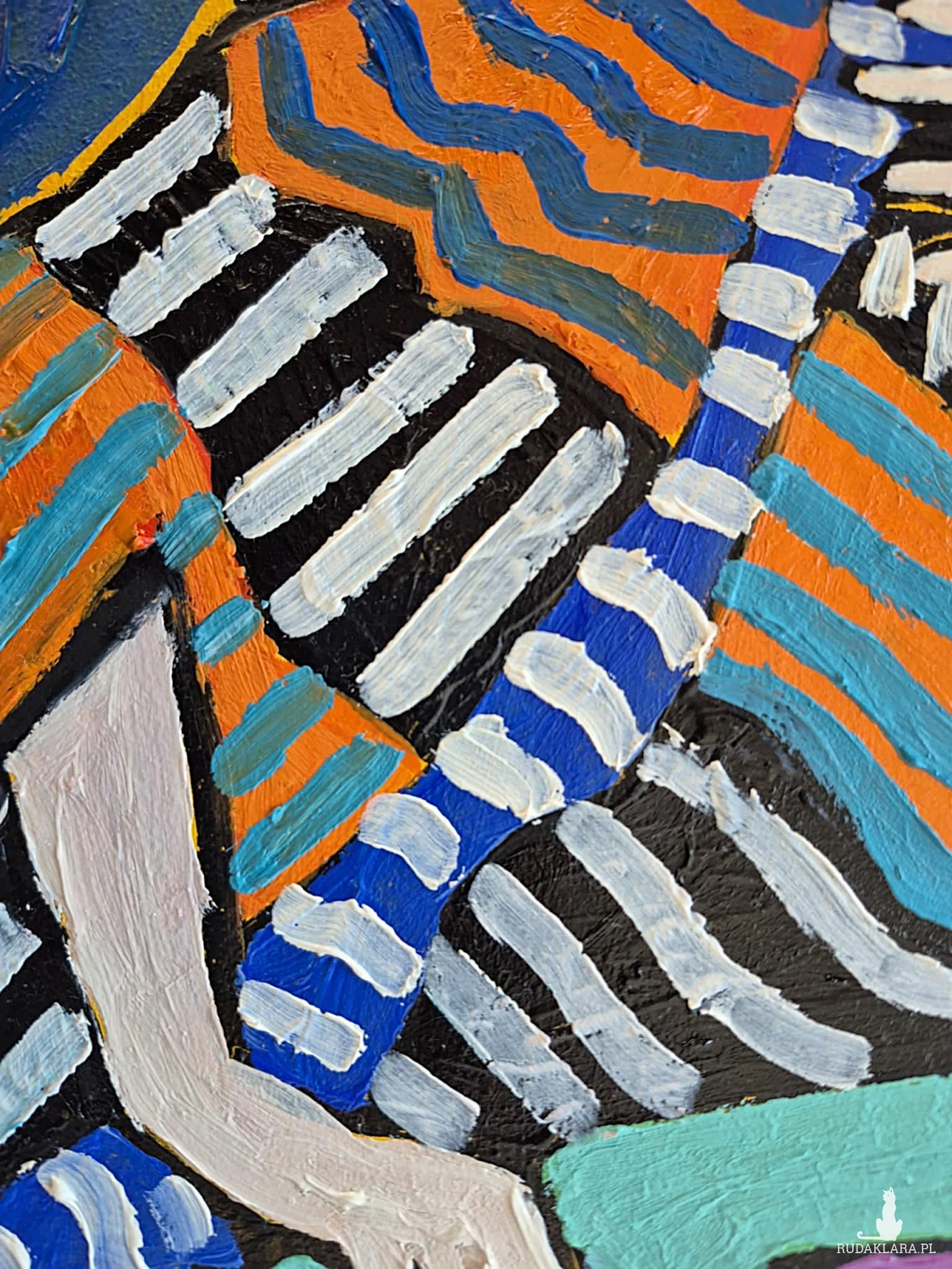 Na pierwszym planie siedzi kobieta — ułożona swobodnie, niemal teatralnie, jakby była częścią własnej dekoracji. Jej ciało oplata suknia zbudowana z pasów: falujących, niespokojnych, rytmicznych. Pomarańcz, błękit, biel i czerń pulsują jak emocje — raz ciepłe, raz chłodne — tworząc wizualną melodię, która prowadzi wzrok po całej powierzchni płótna. Materia nie jest miękka, lecz malarska: gruba farba, widoczny ślad pędzla, świadoma sztuczność.
