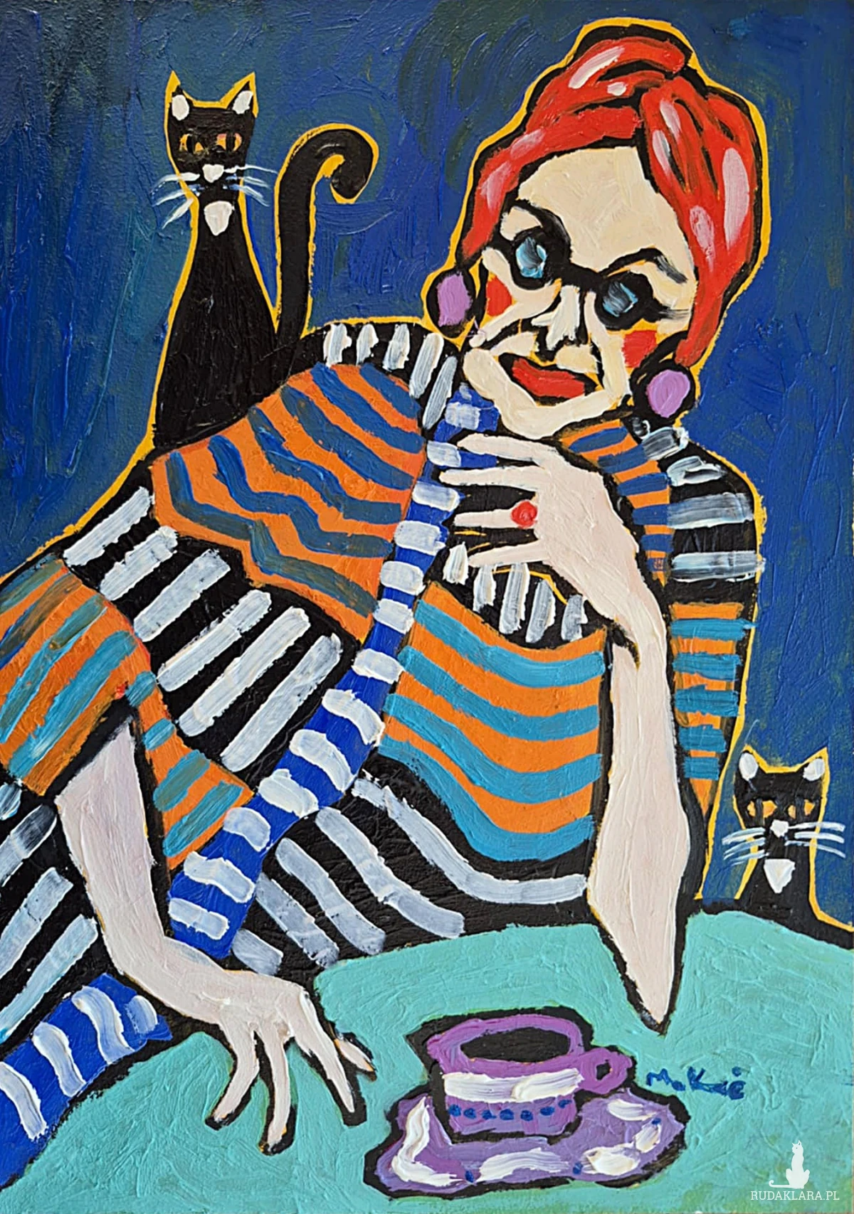 Na dole — filiżanka. Mała, fioletowa, niepozorna, a jednak znacząca. Jak pauza w rozmowie. Jak ślad codzienności w świecie zbudowanym z koloru i symbolu.
