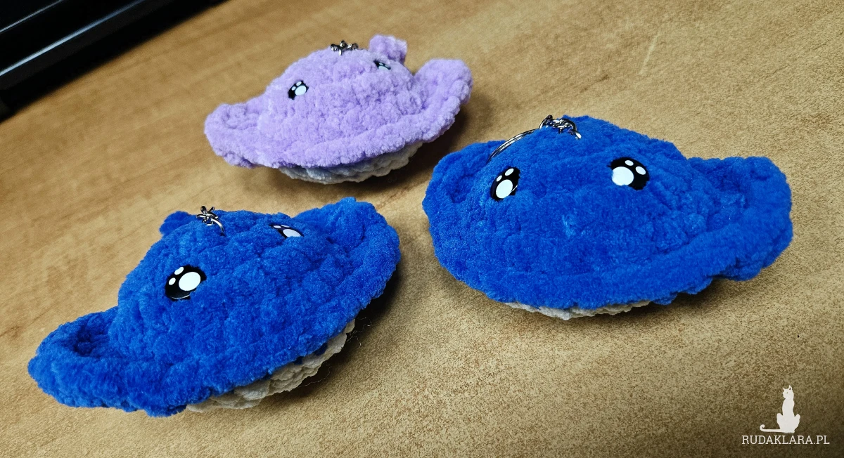 Witam. Mam na sprzedaż 2 breloki różowego koloru i 2 niebieskiego. Praca wykonana z wlóczki 100% mikropoliester i wypełniona 100% białego silikonu. Rozmiary malutkie 10x10x5 cm. Waga 25 g. Serdecznie zapraszam do zakupu.