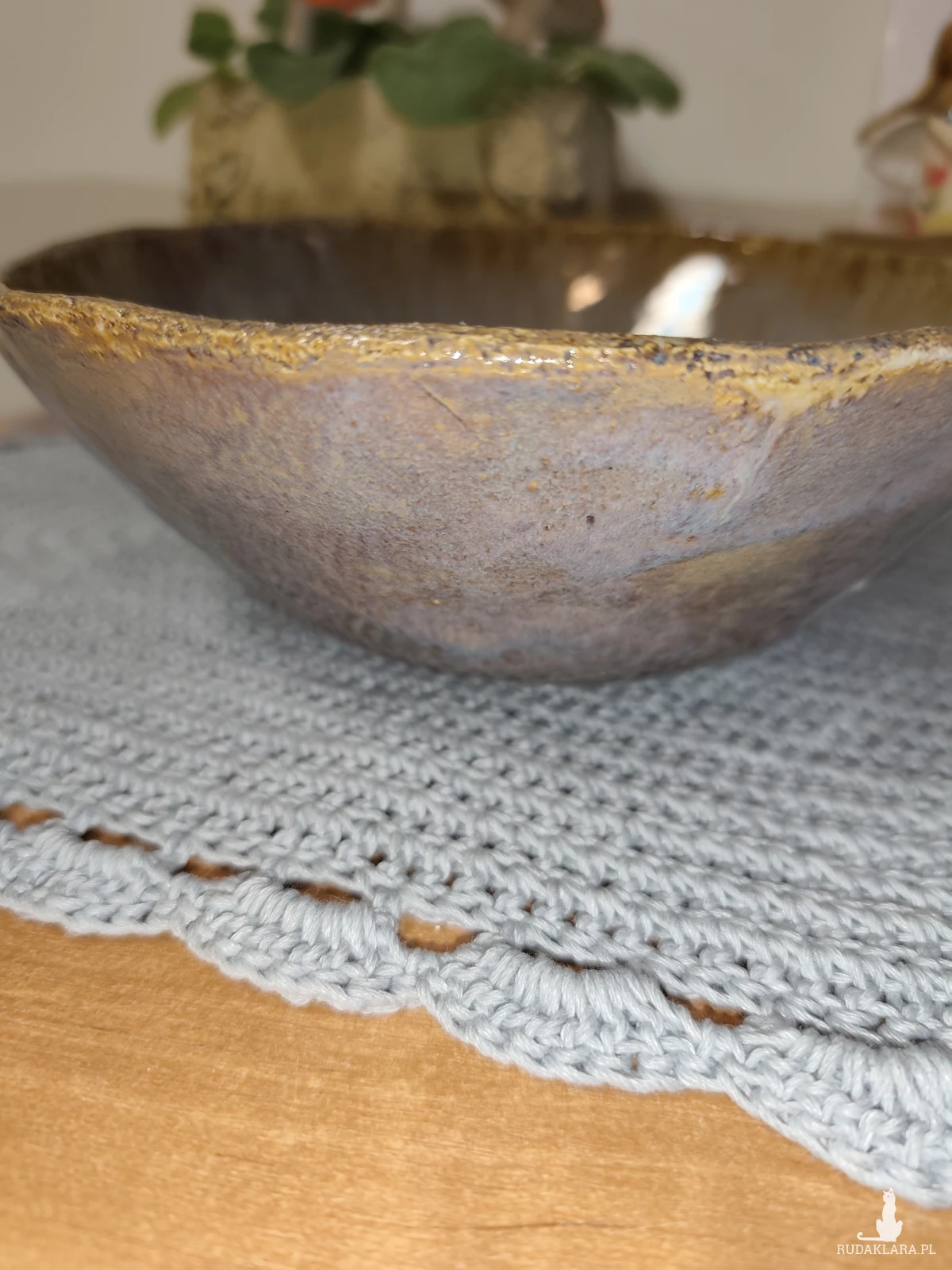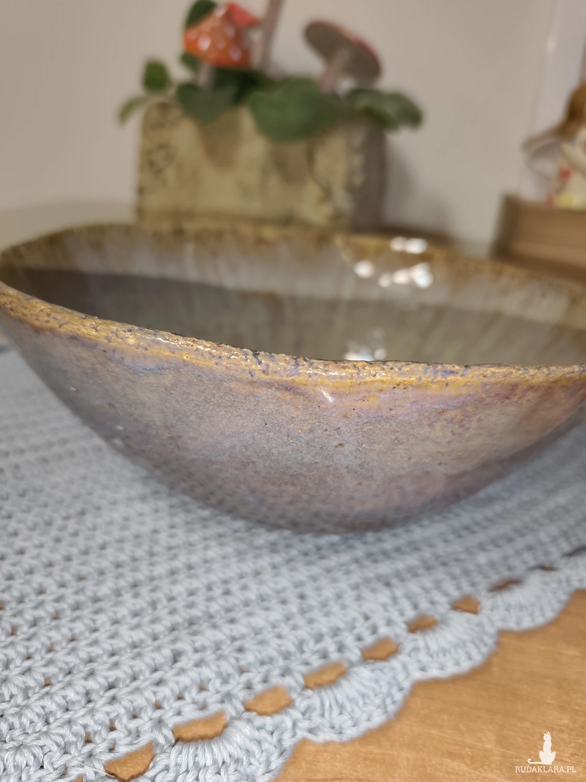 Misa ceramiczna ręcznie wykonana, szkliwiona w dwukrotnie wypalana w piecu ceramicznym na wysoką temperaturę. Można w niej podawać sałatkę, szkliwa przeznaczone do kontaktu z żywnością Średnica około 22cm.