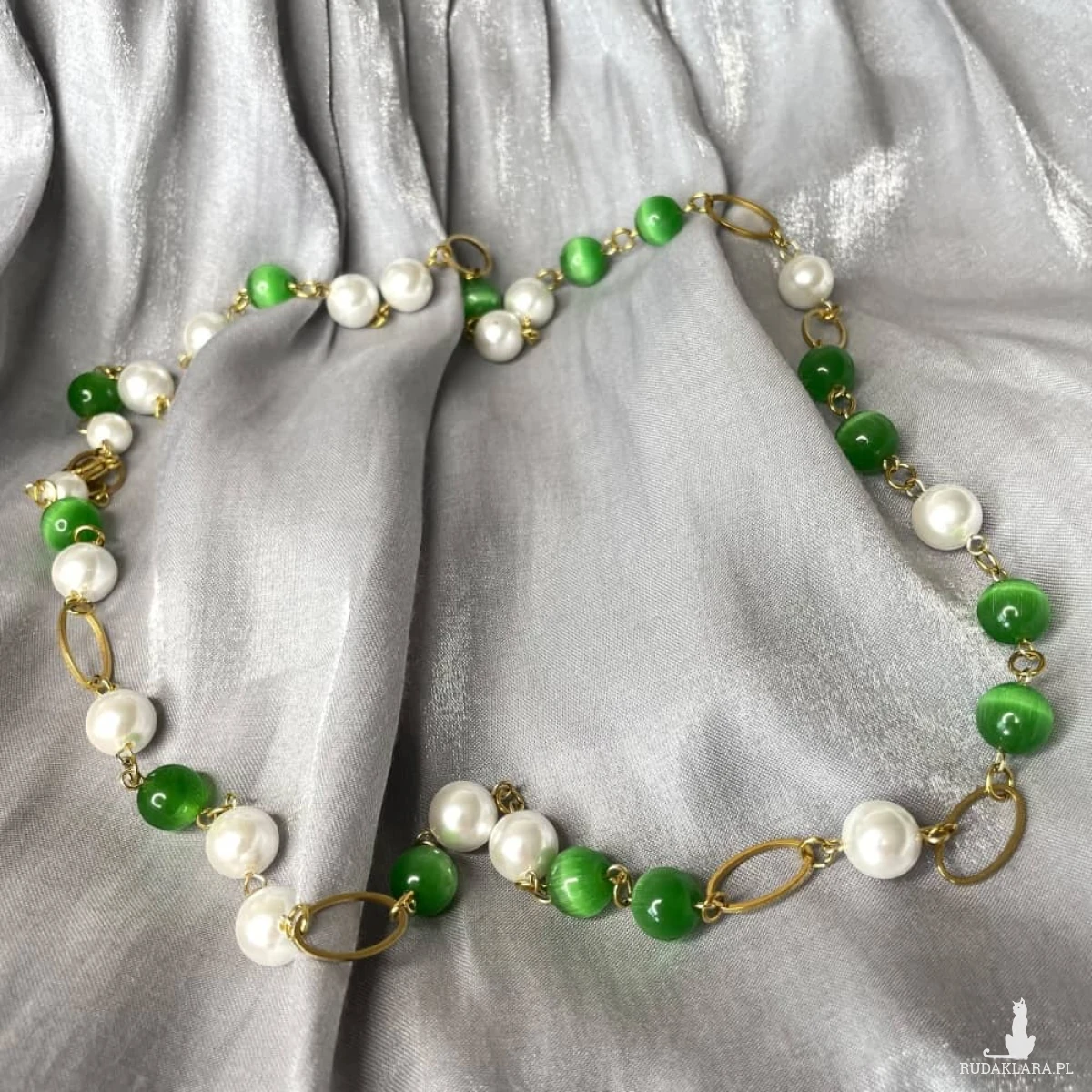 Naszyjnik z perłami i zielonym kocim okiem to elegancka interpretacja klasyki w nowoczesnym wydaniu. Lekka forma oparta na owalnych ogniwach tworzy subtelną, harmonijną całość, w której naturalny blask pereł spotyka się z głęboką zielenią kamieni o charakterystycznym, migotliwym połysku. Efekt kociego oka wprowadza nutę tajemniczości i głębi, a złocone detale delikatnie podkreślają szlachetny charakter kompozycji. To biżuteria, która zachwyca równowagą między ponadczasową elegancją a świeżym, współczesnym akcentem.