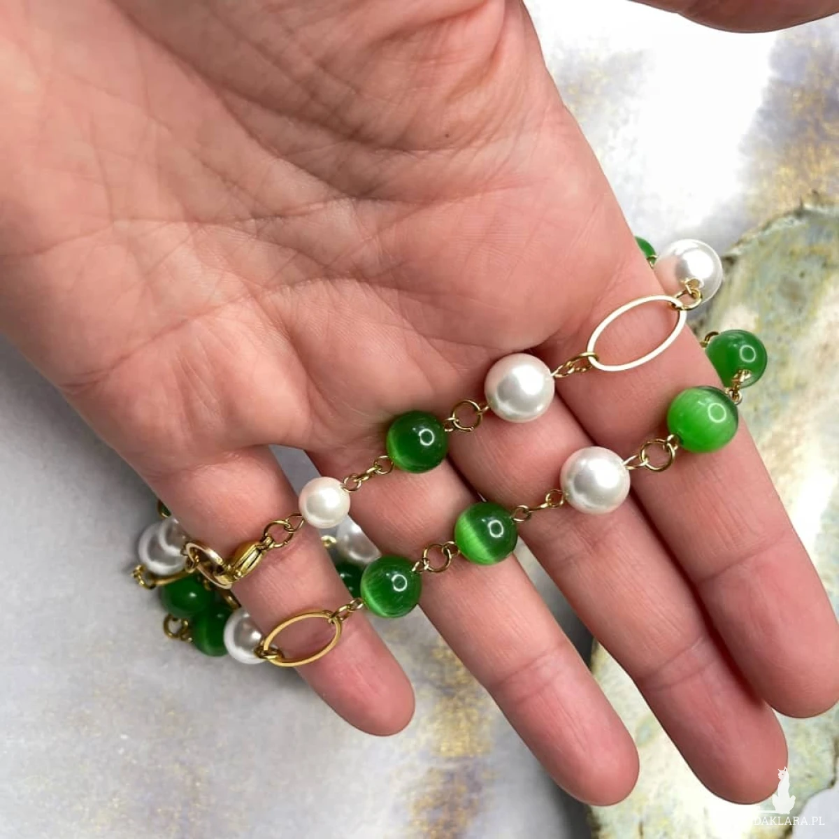 Materiał: perły seashell, uleksyt (kocie oko), pozłacana stal chirurgiczna