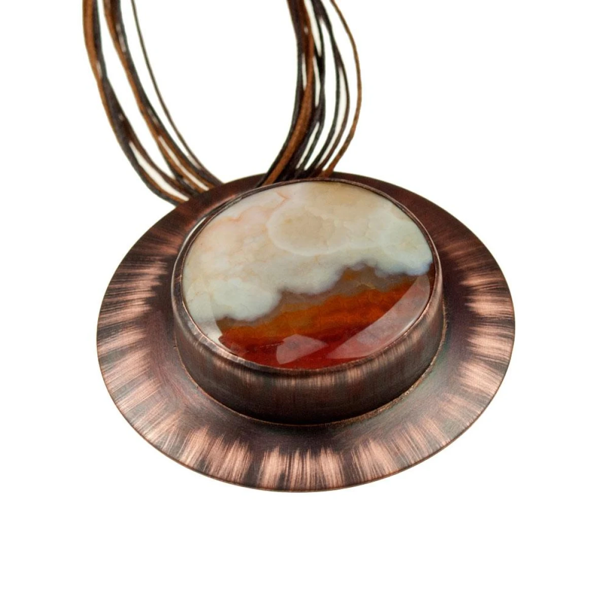 Wisior został wykonany ręcznie z blachy miedzianej i okrągłego agatu. Kamień ma średnicę ok. 40-45 mm i cechuje się wybarwieniem, które przywodzi na myśl intensywny wybuch wulkanu lub chmury unoszące się nad pustynią. W procesie tworzenia wisiora blacha była polerowana, matowiona, a następnie malowana oksydą i przecierana, dzięki czemu powstał niepowtarzalny efekt kolorystyczny. Blacha otaczająca agat jest lekko wypukła oraz zabezpieczona warstwą ochronną. Miedziane koło, którego centralnym elementem jest jedyny w swoim rodzaju agat, ma średnicę ok 7 cm.