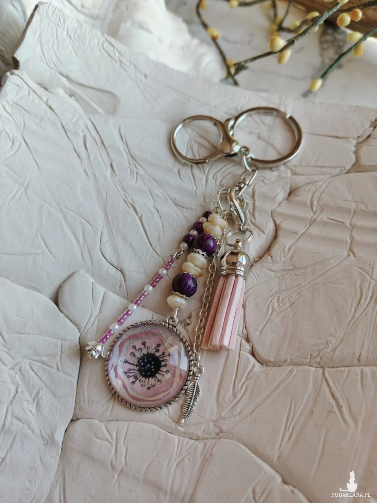 Wyjątkowy brelok handmade, który łączy delikatność pudrowego różu z elegancją srebrnych detali. Kompozycja koralików, subtelnego chwosta oraz okrągłej zawieszki z motywem kwiatowym sprawia, że brelok jest nie tylko praktycznym dodatkiem, ale także stylową biżuterią do kluczy, torebki lub plecaka. Idealny dla osób ceniących unikatowe, ręcznie wykonane akcesoria z duszą.