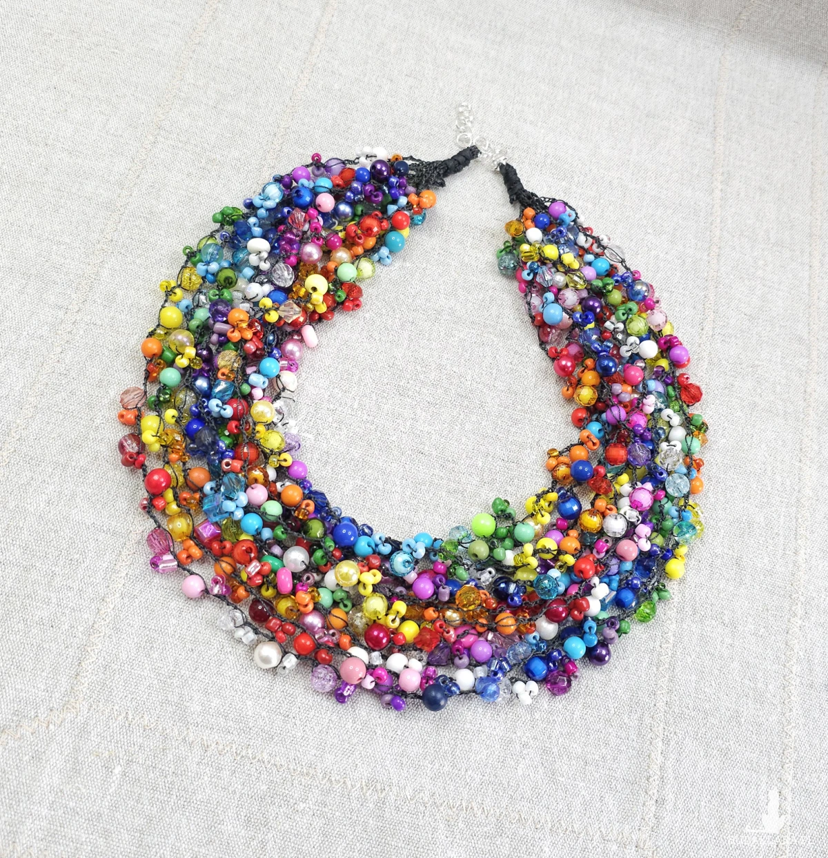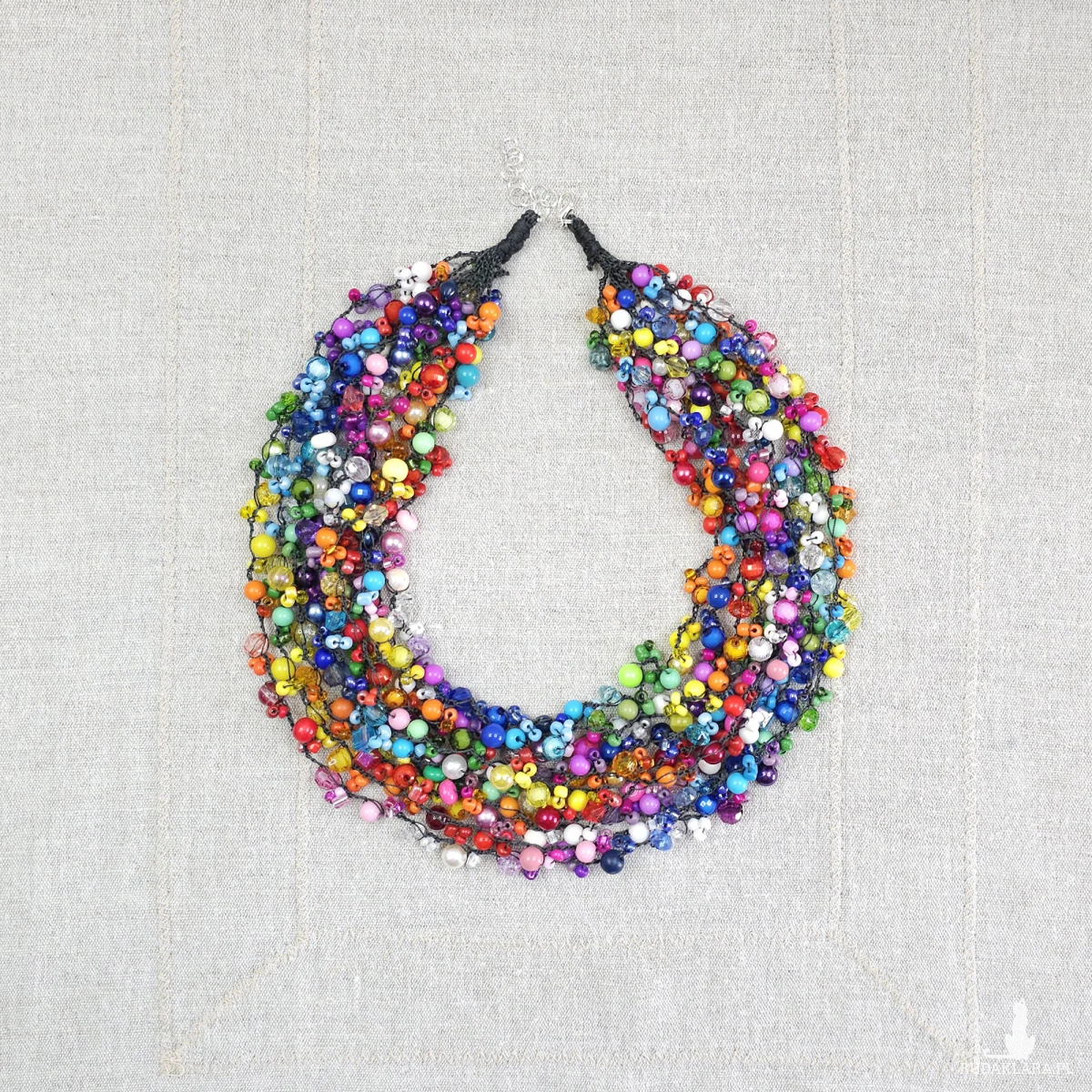 Setki drobnych koralików w niemal każdym odcieniu tęczy zostały splecione w kaskadową formę, tworząc bogatą i efektowną całość.
