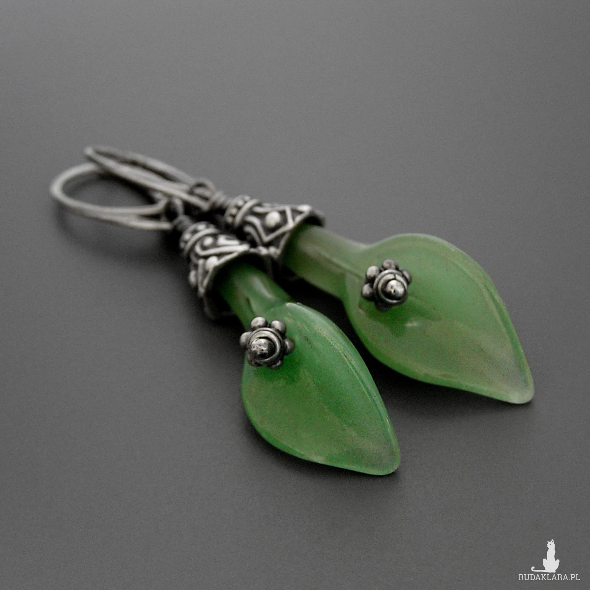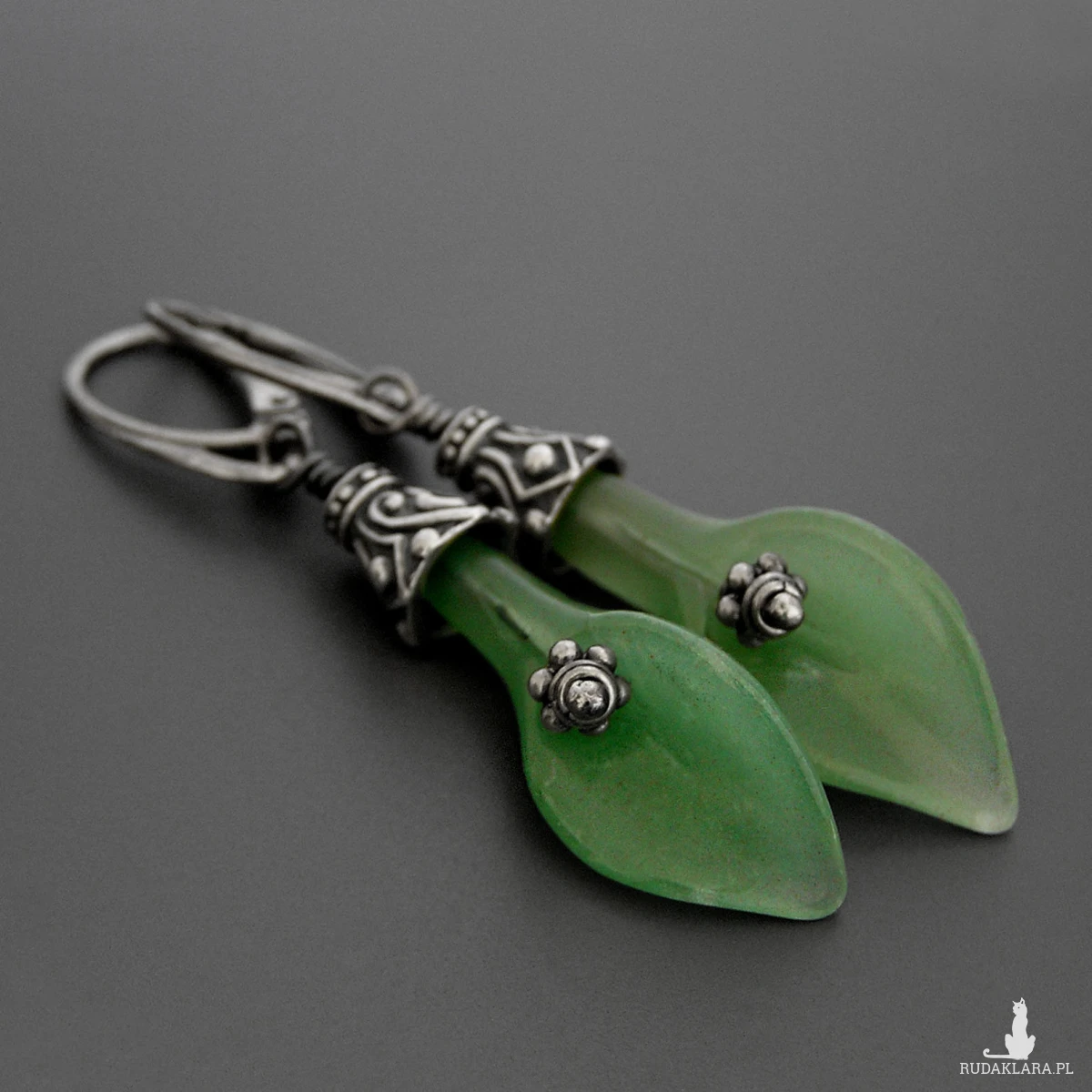 Kolczyki Scarlett, jadeitowe kalie, srebro patynowane, kolekcja Przeminęło z Wiatrem