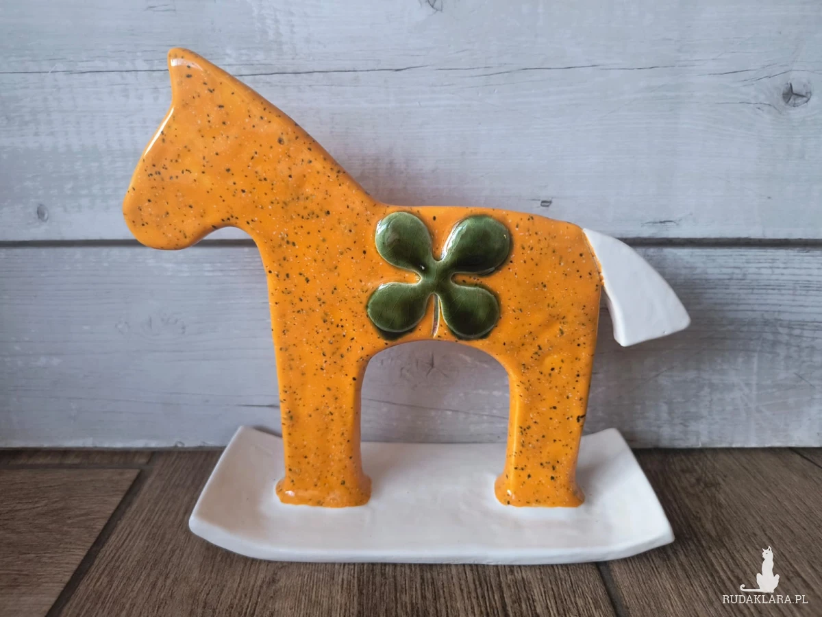 Ceramiczny konik na biegunach wykonany z gliny szamotowej, wypalony na biskwit, a następnie szkliwiony w temperaturze 1260 stopni C. Wymiary: ok. 11 cm x 9 cm. W stylu ludowym. Serdecznie polecam!