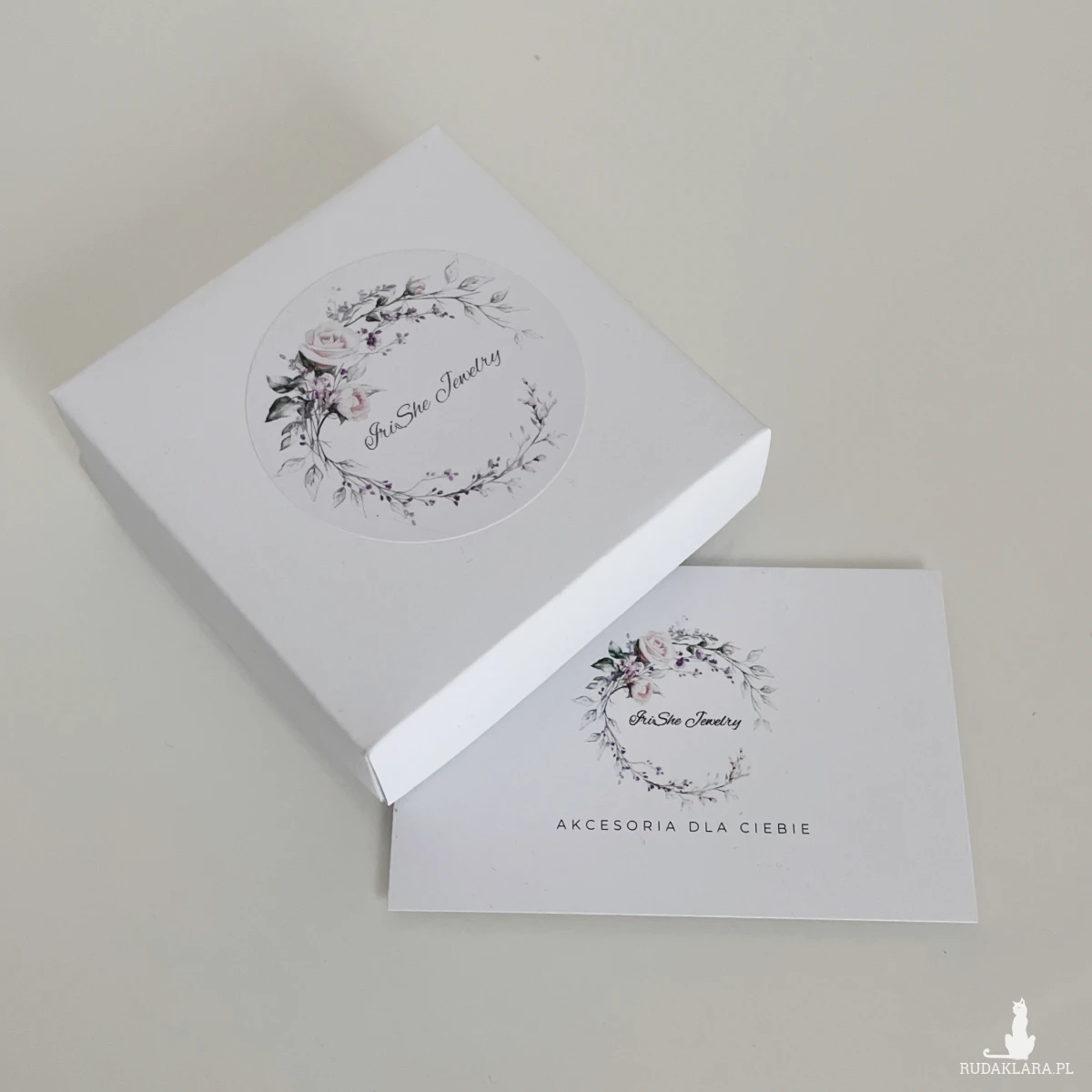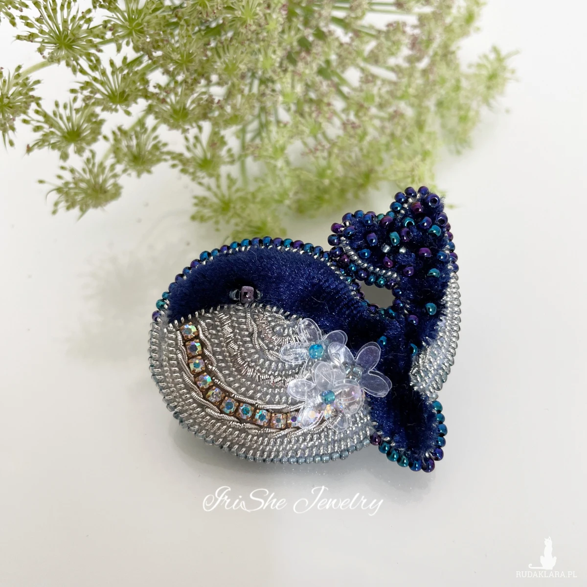 Broszka zapakowana na prezent w eleganckie ozdobne pudełko z logo pracowni IriShe Jewelry.
